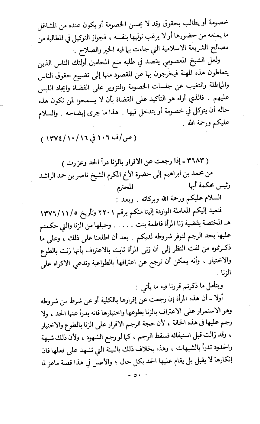 فنعيد إليكم المعاملة الواردة إلينا منكم برقم 2201 وتاريخ 5/11/1376هـ المختصة بقضية زنا المرأة فاطمة بنت ... وحبلها من الزنا والتي حكمتم عليها بحد الرجم لتوفر شروطه لديكم. بعد أن اطلعنا على ذلك، وعلى ما ذكرتموه من لفت النظر إلى أن زنى المرأة ثابت بالاعتراف أنها زنت بالطوع والاختيار. وأنه يسكن أن ترجع عن اعترافها بالطواعية وتدعي الإكراه على الزنا.