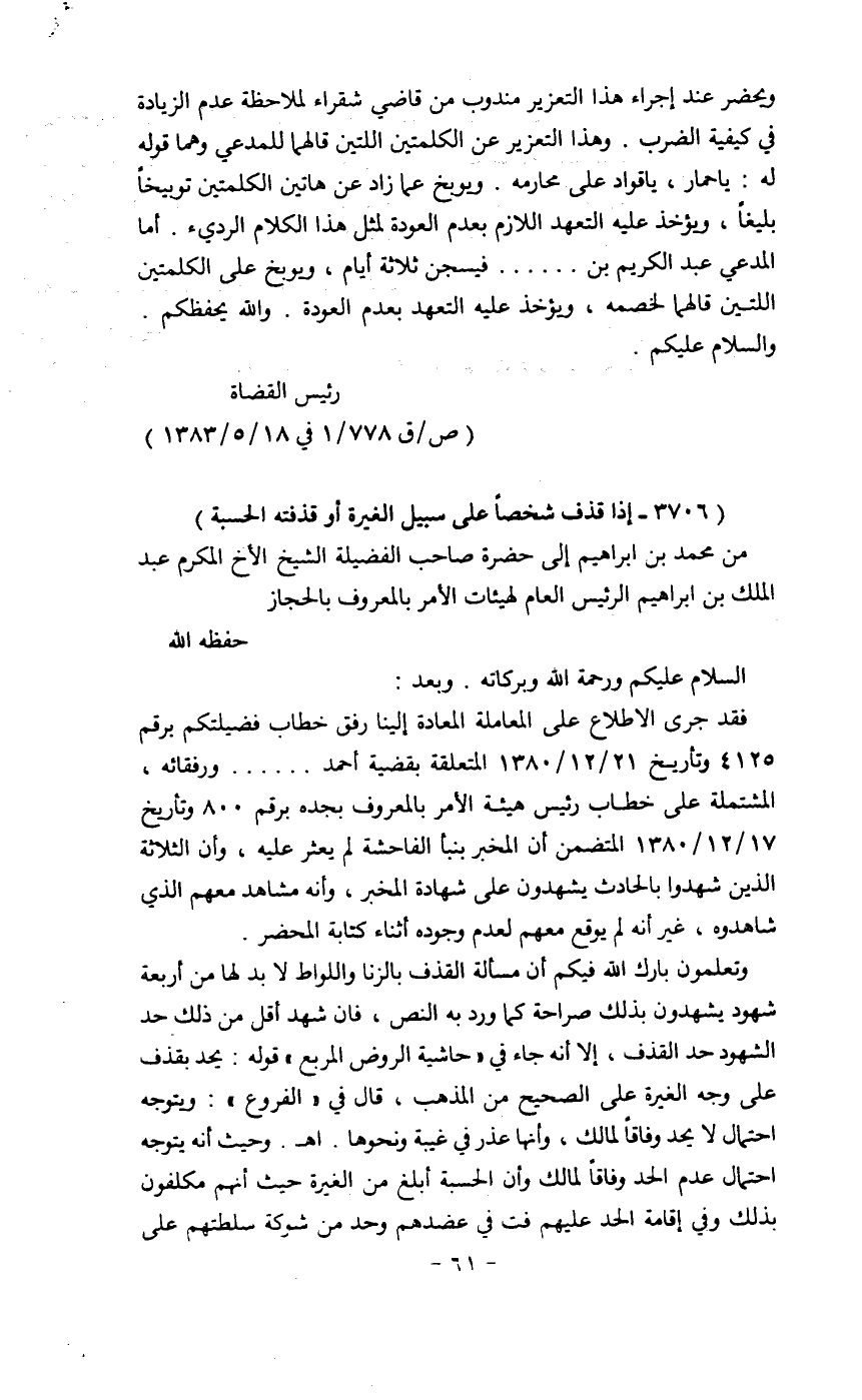 فقد جرى الإطلاع على المعاملة المعادة إلينا رفق خطاب فضيلتكم برقم 4125 وتاريخ 21/12/1380 المتعلقة بقضية أحمد.... ورفقائه، المشتملة على خطاب رئيس هيئة الأمر بالمعروف بجدة برقم 800 وتاريخ 17/12/1380 المتضمن أن المخبر بنبأ الفاحشة لم يعثر عليه، وأن الثلاثة الذين شهدوا بالحادث يشهدون على شهادة المخبر، وأنه مشاهد معهم الذي شاهدوه، غير أنه لم يوقع معهم لعدم وجوده أثناء كتابة المحضر.