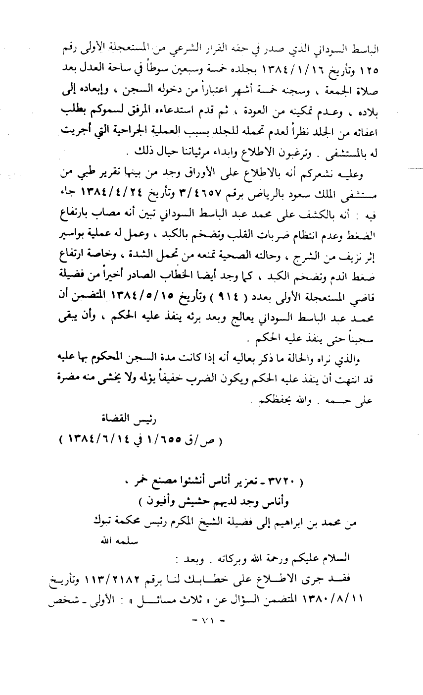 الباسط السوداني الذي صدر في حقه القرار الشرعي من المستعجلة الأولى رقم 125 وتاريخ 16/1/1384 بجلده خمسة وسبعين سوطاً في ساحة العدل بعد صلاة الجمعة، وسجنه خمسة أشهر اعتباراً من دخوله السجن، وإبعاده إلى بلاده، وعدم تمكينه من العودة، ثم قدم استدعاءه المرفق لسموكم بطلب إعفائه من الجلد نظراً لعدم تحمله للجلد بسبب العملية الجراحية التي أجريت له بالمستشفى. وترغبون الإطلاع وإبداء مرئياتنا حيال ذلك.