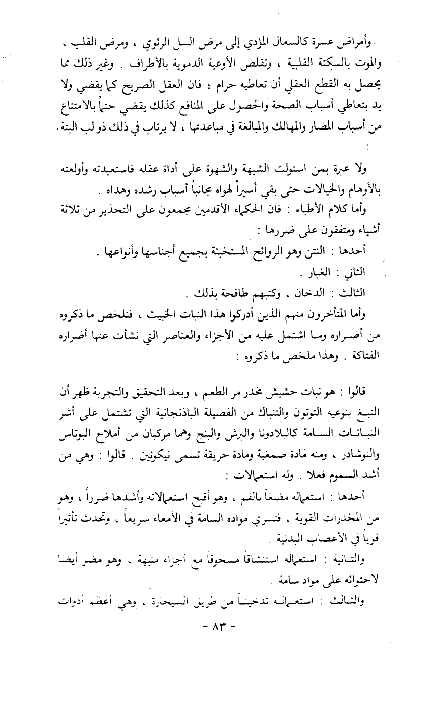 وأمراض عسرة كالسعال المؤدي إلى مرض السل الرئوي ومرض القلب والموت بالسكتة القلبية، وتقلص الأوعية الدموية بالأطراف. وعير ذلك مما يحصل به القطع العقلي أن تعاطيه حرام، فإن العقل الصريح كما يقضي ولا بد بتعاطي أسباب الصحة والحصول على المنافع كذلك يقضي حتماً بالامتناع من أسباب المضار والمهالك والمبالغة في مباعدتها، لا يرتاب في ذلك ذولب البتة.