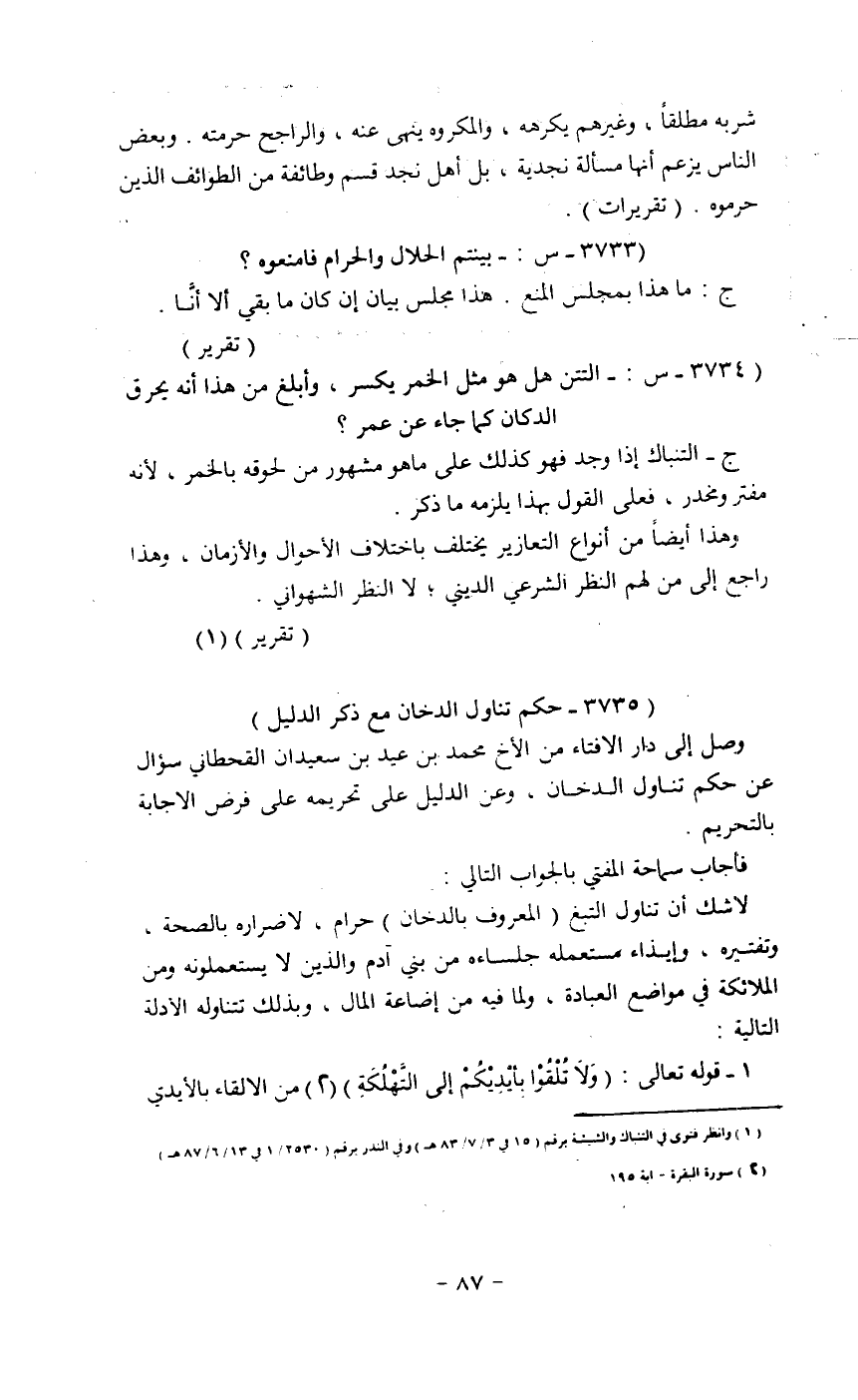 (¬1) وانظر فتوى في التنباك والشيشة برقم 15 في 3/7/83هـ وفي التقرير برقم (2530/1 في 13/6/87هـ) .
