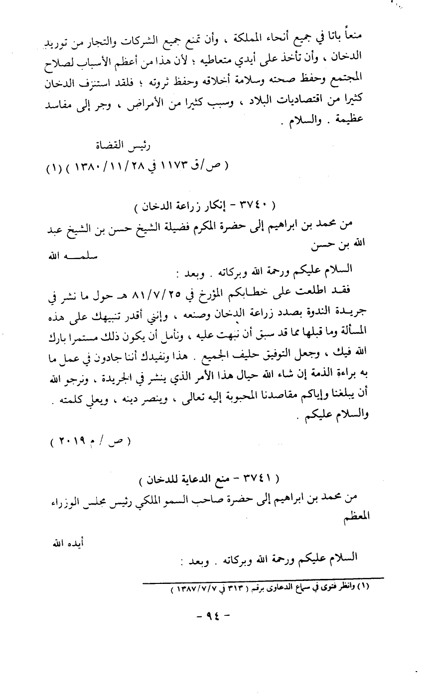 فقد اطلعت على خطابكم المؤرخ في 25/7/81هـ حول ما نشر في جريدة الندوة بصدد زراعة الدخان وصنعه، وإنني أقدر تنبيهك على هذه المسألة وما قبلها مما قد سبق أن نبهت عليه، ونأمل أن يكون ذلك مستمراً بارك الله فيك، وجعل التوفيق حليف الجميع. هذا ونفيدك أننا جادون في عمل ما به براءة الذمة إن شاء الله حيال هذا الأمر الذي ينشر في الجريدة، ونرجو الله أن يبلغنا وإياكم مقاصدنا المحبوبة إليه تعالى. وينصر دينه. ويعلي كلمته. والسلام عليكم.