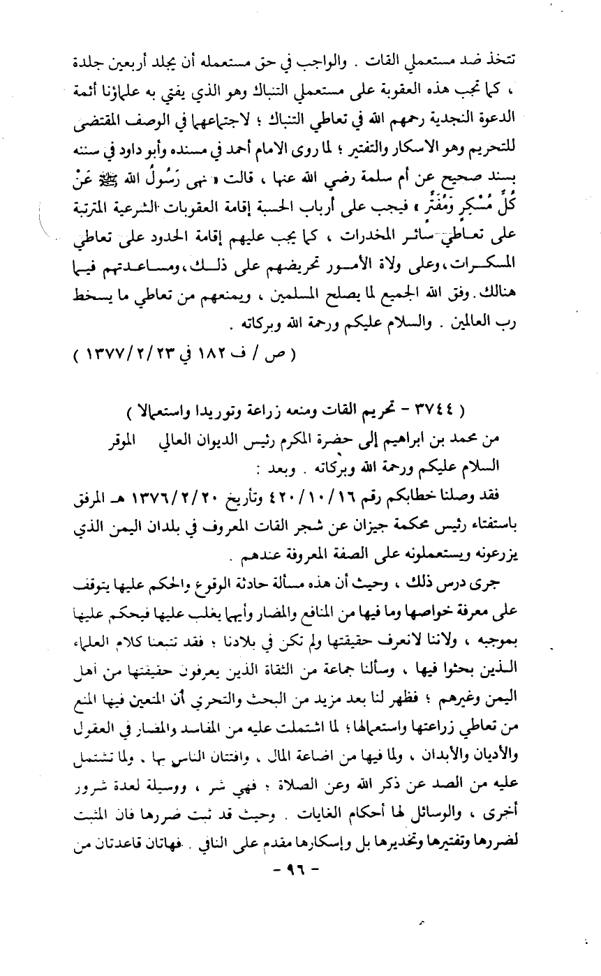 فقد وصلنا خطابكم رقم 16/10/420 وتاريخ 20/2/1376هـ المرفق باستفتاء رئيس محكمة جيزان عن شجر القات المعروف في بلدان اليمن الذي يزرعونه ويستعملونه على الصفة المعروفة عندهم.