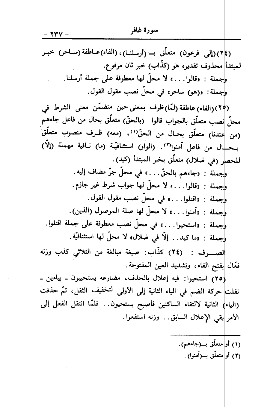على الألف فهو ممنوع من الصرف (إماما) حال منصوبة من كتاب عاملها يتلوه، (الواو) عاطفة (رحمة) معطوفة على (إماما) منصوب (أولئك) مثل الأول (يؤمنون) مثل يعملون (به) مثل منه متعلّق ب (يؤمنون) ، (الواو) عاطفة (من) مرّ إعرابه «1» ، (يكفر) مضارع مجزوم فعل الشرط، والفاعل هو (به) مثل منه متعلّق ب (يكفر) ، (من الأحزاب) جارّ ومجرور متعلّق بحال من فاعل يكفر (الفاء) رابطة لجواب الشرط (النار) مبتدأ مرفوع (موعد) خبر مرفوع و (الهاء) مضاف إليه (الفاء) عاطفة لربط المسبّب بالسبب (لا) ناهية جازمة (تك) مضارع مجزوم وعلامة الجزم السكون الظاهر على النون المحذوفة للتخفيف، واسمه ضمير مستتر تقديره أنت «2» ، (في مرية) جارّ ومجرور متعلّق بخبر تك (منه) مثل الأول متعلّق بنعت لمرية (إنّ) حرف مشبّه بالفعل و (الهاء) ضمير في محلّ نصب اسم إنّ (الحقّ) خبر مرفوع (من ربّ) مثل الأول متعلّق بحال من الحقّ..