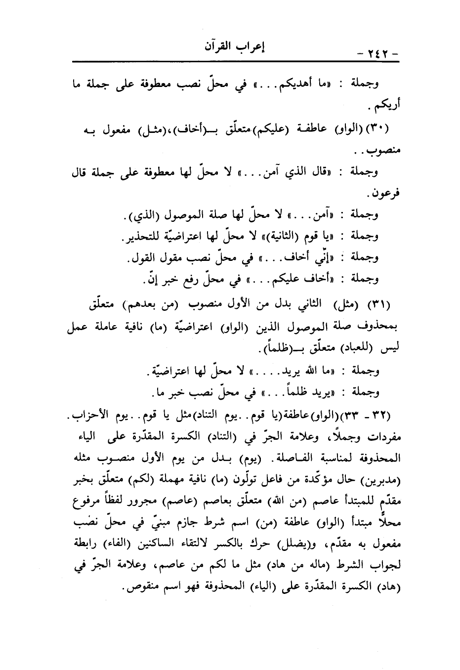 (أولئك) مبتدأ «1» ، (لم) حرف نفي وجزم (يكونوا) مضارع ناقص مجزوم وعلامة الجزم حذف النون.. والواو اسم كان (معجزين) خبر المبتدأ منصوب وعلامة النصب الياء (في الأرض) جارّ ومجرور متعلّق بمعجزين (الواو) عاطفة (ما) نافية (كان) ماض ناقص- ناسخ- (اللام) حرف جرّ و (هم) ضمير في محلّ جرّ متعلّق بمحذوف خبر كان (من دون) جارّ ومجرور حال من أولياء (من) حرف جرّ زائد (أولياء) مجرور لفظا مرفوع محلّا اسم كان مؤخّر، وعلامة الجرّ الفتحة فهو ممنوع من الصرف، اسم منته بألف التأنيث الممدودة على وزن أفعلاء (يضاعف) مضارع مبنيّ للمجهول مرفوع (لهم) مثل الأول متعلّق ب (يضاعف) ، (العذاب) نائب الفاعل (ما) مثل الأولى «2» ، (كانوا) فعل ماض ناقص مبنيّ على الضمّ.. والواو اسم كان (يستطيعون) مضارع مرفوع.. والواو فاعل (السمع) مفعول به منصوب (الواو) عاطفة (ما كانوا يبصرون) مثل ما كانوا يستطيعون.