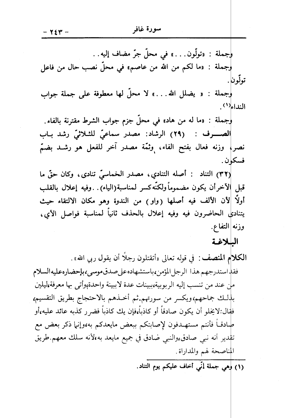 (أولئك الذين) مبتدأ وخبر- وقد مرّ إعرابهما «1» -، (خسروا) مثل كذبوا «2» ، (أنفس) مفعول به منصوب و (هم) ضمير مضاف إليه (الواو) عاطفة (ضلّ) فعل ماض (عن) حرف جرّ و (هم) ضمير في محلّ جرّ متعلّق ب (ضلّ) بتضمينه معنى غاب (ما) اسم موصول مبنيّ في محلّ نصب مفعول به، والعائد محذوف (كانوا يفترون) مثل كانوا يستطيعون «3» .