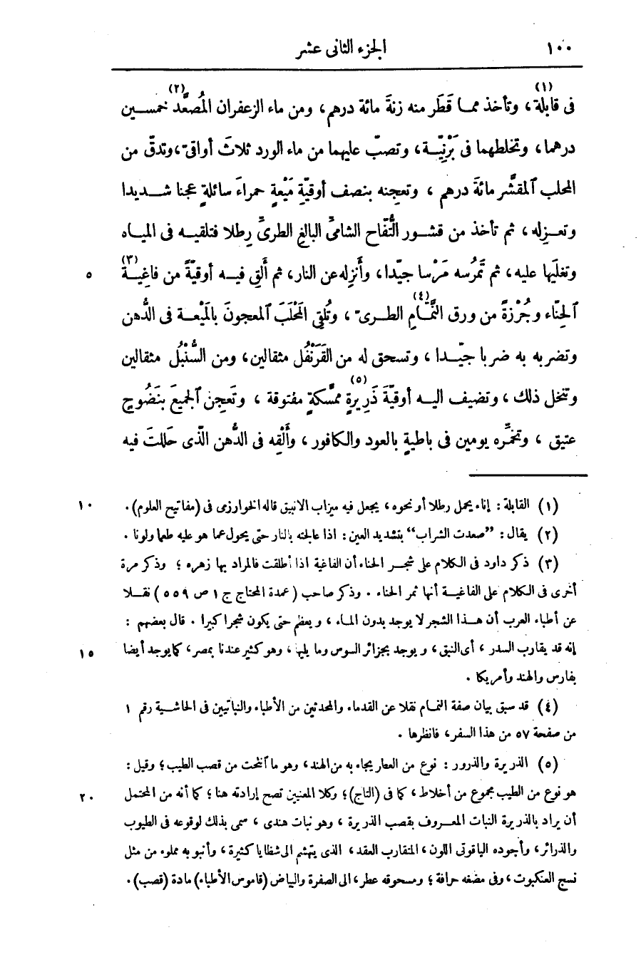فى قابلة «1» ، وتأخذ مما قطر منه زنة مائة درهم، ومن ماء الزعفران المصعّد «2» خمسين درهما، وتخلطهما فى برنيّة، وتصبّ عليهما من ماء الورد ثلاث أواقىّ، وتدقّ من المحلب المقشّر مائة درهم، وتعجنه بنصف أوقيّة ميعة حمراء سائلة عجنا شديدا وتعزله، ثم تأخذ من قشور التّفّاح الشامىّ البالغ الطرىّ رطلا فتلقيه فى المياه وتغليها عليه، ثم تمرسه مرسا جيّدا، وأنزله عن النار، ثم ألق فيه أوقيّة من فاغية «3» الحنّاء وجرزة من ورق النّمّام «4» الطرىّ، وتلقى المحلب المعجون بالميعة فى الدّهن وتضربه به ضربا جيّدا، وتسحق له من القرنفل مثقالين، ومن السّنبل مثقالين وتنخل ذلك، وتضيف اليه أوقيّة ذريرة «5» ممسّكة مفتوقة، وتعجن الجميع بنضوح عتيق، وتخمّره يومين فى باطية بالعود والكافور، وألقه فى الدّهن الّذى حللت فيه