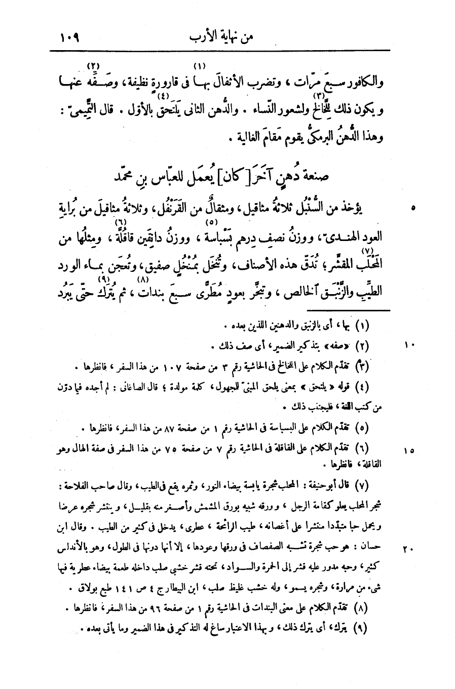 والكافور سبع مرّات، وتضرب الأثفال بها «1» فى قارورة نظيفة، وصفّه «2» عنها ويكون ذلك للّخالخ «3» ولشعور النّساء. والدّهن الثانى يلتحق «4» بالأوّل. قال التّميمىّ: