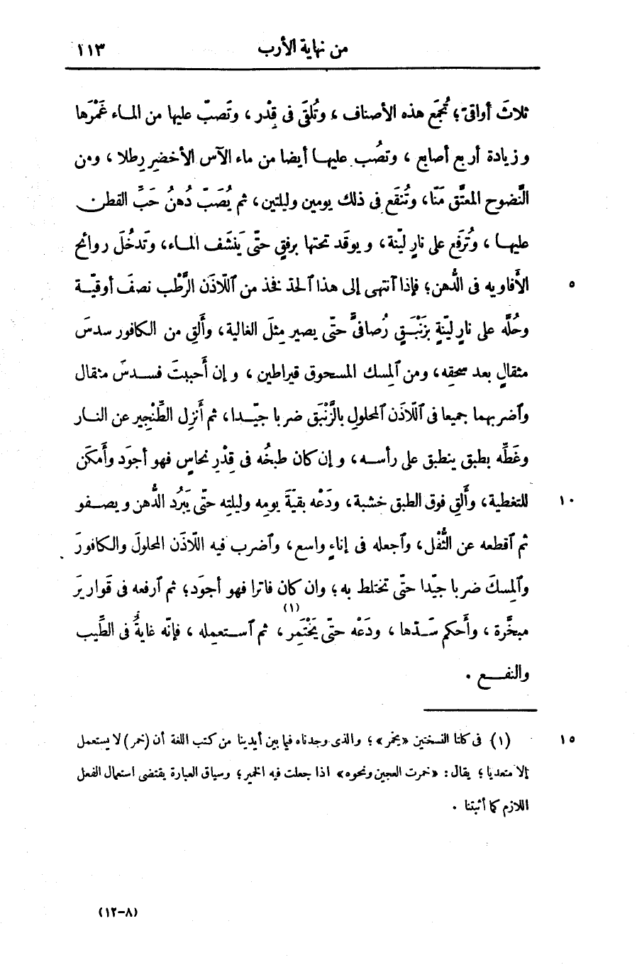 ثلاث أواقىّ؛ تجمع هذه الأصناف، وتلقى فى قدر، وتصبّ عليها من الماء غمرها وزيادة أربع أصابع، وتصب عليها أيضا من ماء الآس الأخضر رطلا، ومن النّضوح المعتّق منّا، وتنقع فى ذلك يومين وليلتين، ثم يصبّ دهن حبّ القطن عليها، وترفع على نار ليّنة، ويوقد تحتها برفق حتّى ينشف الماء، وتدخل روائح الأفاويه فى الدّهن؛ فإذا انتهى إلى هذا الحدّ فخذ من اللّاذن الرّطب نصف أوقيّة وحلّه على نار ليّنة بزنبق رصافىّ حتّى يصير مثل الغالية، وألق من الكافور سدس مثقال بعد سحقه، ومن المسك المسحوق قيراطين، وإن أحببت فسدس مثقال واضربهما جميعا فى اللّاذن المحلول بالزّنبق ضربا جيّدا، ثم أنزل الطّنجير عن النار وغطّه بطبق ينطبق على رأسه، وإن كان طبخه فى قدر نحاس فهو أجود وأمكن للتغطية، وألق فوق الطبق خشبة، ودعه بقيّة يومه وليلته حتّى يبرد الدّهن ويصفو ثم اقطعه عن الثّفل، واجعله فى إناء واسع، واضرب فيه اللّاذن المحلول والكافور والمسك ضربا جيّدا حتّى تختلط به؛ وان كان فاترا فهو أجود؛ ثم ارفعه فى قوارير مبخّرة، وأحكم سدّها، ودعه حتّى يختمر «1» ، ثم استعمله، فإنّه غاية فى الطّيب والنفع.