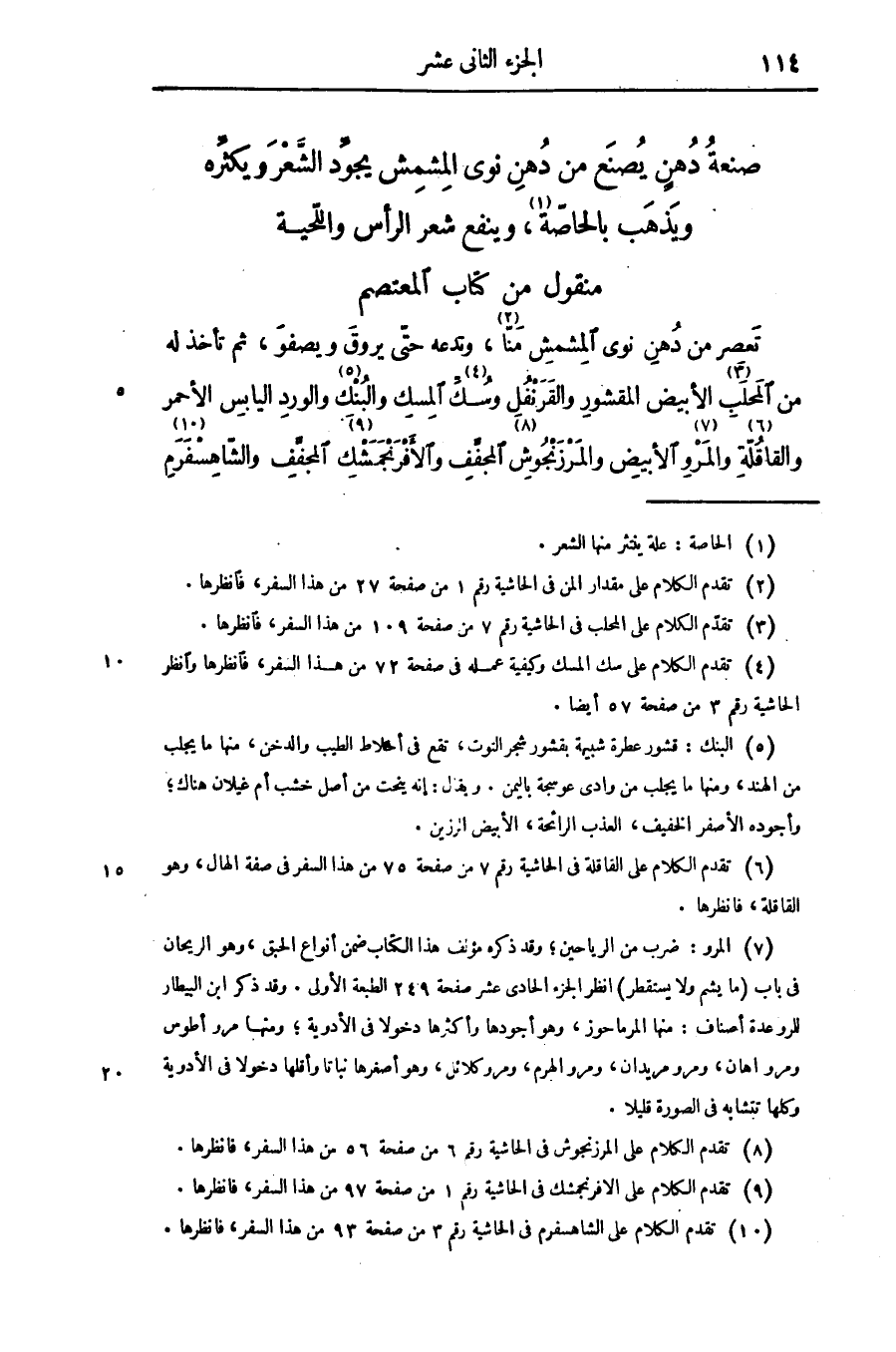 صنعة دهن يصنع من دهن نوى المشمش يجوّد الشّعر ويكثّره ويذهب بالحاصّة «1» ، وينفع شعر الرأس واللّحية منقول من كتاب المعتصم