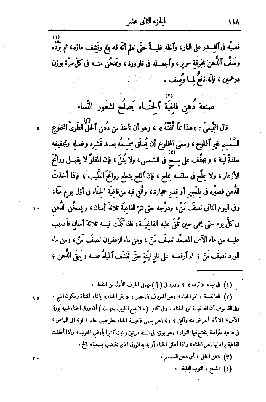 قال التّميمىّ: «هذا ممّا ألفّته» ، وهو أن تأخذ من دهن الحلّ «3» الطّرىّ المخلوع السّمسم غير المملوح، ومعنى المخلوع أن يسلق سمسمه بعد قشره وغسله وتجفيفه سلقة ليّنة، ويجفّف على مسح «4» فى الشمس، ولا يقلى، فإنّ المقلوّ لا يقبل روائح الأزهار، ولا يملّح فى سلقه بملح، فإنّ الملح يقطع روائح الطّيب؛ فإذا أخذت الدّهن فصيّره فى طنجير أو قدر حجارة، وألق فيه من فاغية الحنّاء فى أوّل يوم منّا، وفى اليوم الثانى نصف منّ، ودرّجه حتى تتمّ الفاغية ثلاثة أمنان، ويسخّن الدّهن فى كلّ يوم حتى يحمى حين تلقى عليه الفاغية، فاذا كملت فيه ثلاثة أمنان فآصبب عليه من ماء الآس المصعّد نصف منّ، ومن ماء الزعفران نصف منّ، ومن ماء الورد نصف منّ، ثم ارفعه على نار ليّنة حتّى تنشف المياه عنه ويبقى الدّهن؛