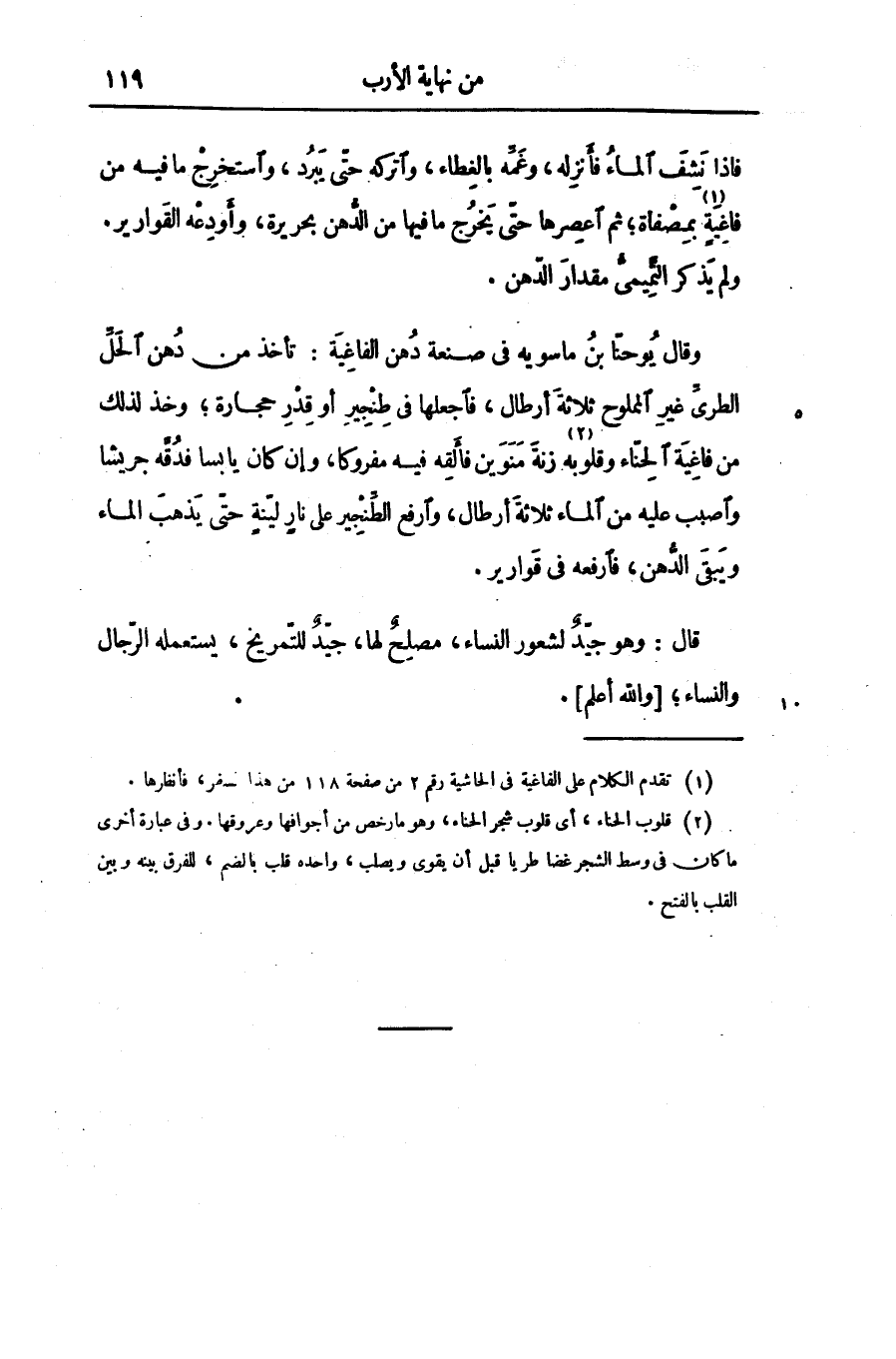 وقال يوحنّا بن ماسويه فى صنعة دهن الفاغية: تأخذ من دهن الحلّ الطرىّ غير المملوح ثلاثة أرطال، فاجعلها فى طنجير أو قدر حجارة؛ وخذ لذلك من فاغية الحنّاء وقلوبه «2» زنة منوين فألقه فيه مفروكا، وإن كان يابسا فدقّه جريشا واصبب عليه من الماء ثلاثة أرطال، وارفع الطّنجير على نار ليّنة حتّى يذهب الماء ويبقى الدّهن، فارفعه فى قوارير.