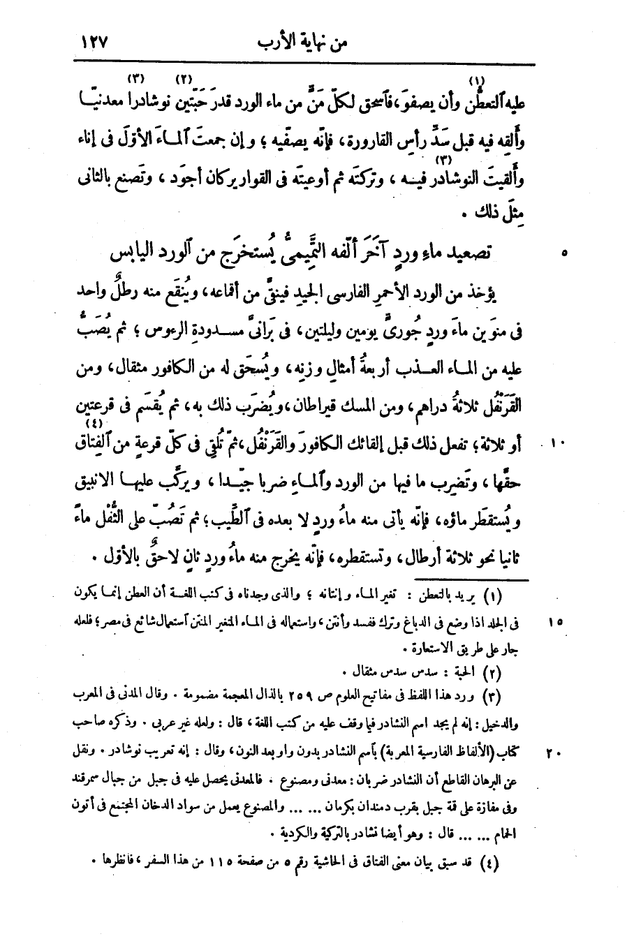 عليه التعطّن «1» وأن يصفو، فاسحق لكلّ منّ من ماء الورد قدر حبّتين «2» نوشادرا «3» معدنيّا وألقه فيه قبل سدّ رأس القارورة، فإنّه يصفّيه؛ وإن جمعت الماء الأوّل فى إناء وألقيت النوشادر فيه، وتركته ثم أوعيته فى القوارير كان أجود، وتصنع بالثانى مثل ذلك.