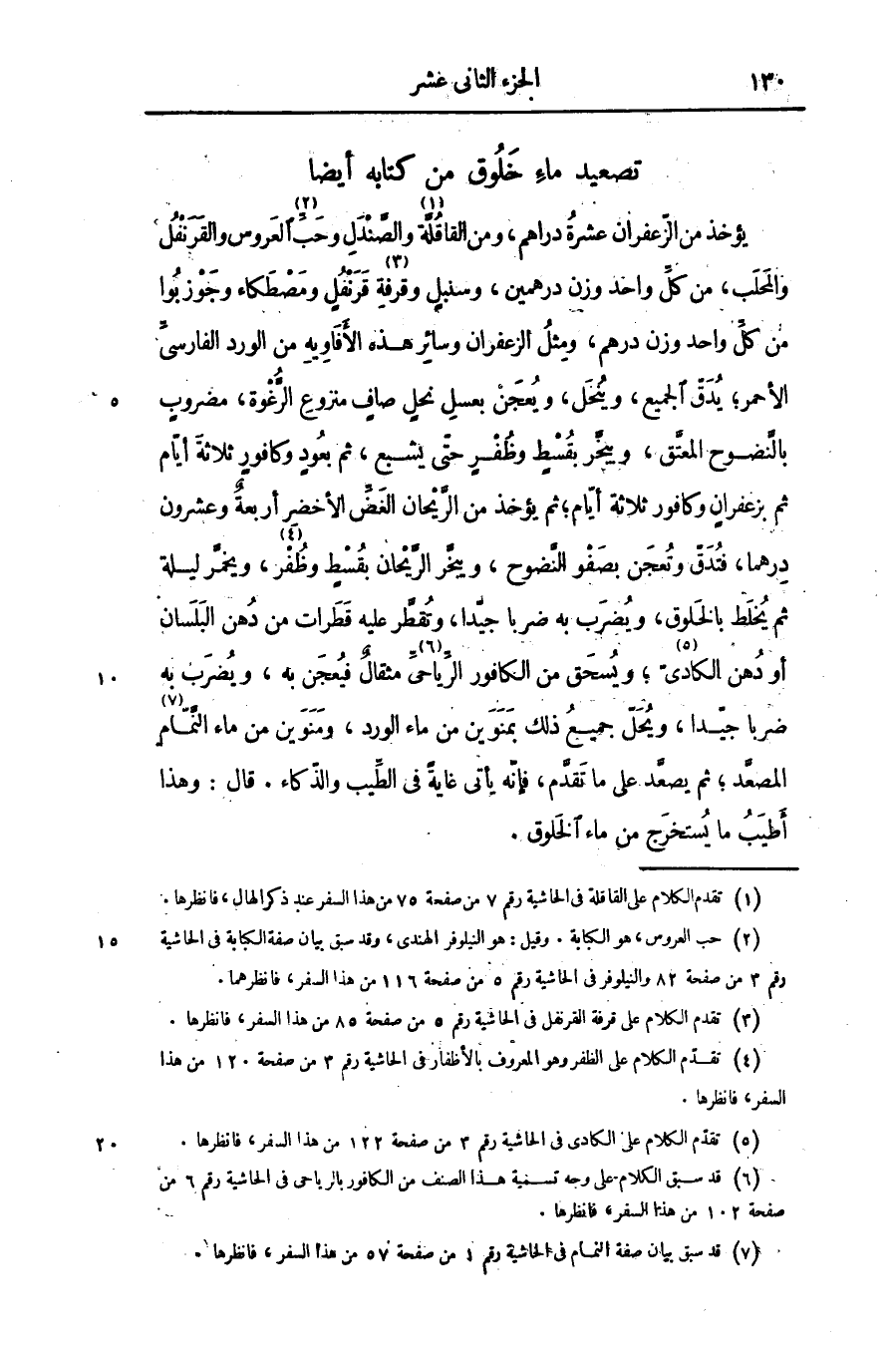 يؤخذ من الزّعفران عشرة دراهم، ومن القاقلّة «1» والصّندل وحبّ «2» العروس والقرنفل والمحلب، من كلّ واحد وزن درهمين، وسنبل وقرفة «3» قرنفل ومصطكاء وجوزبوا من كلّ واحد وزن درهم، ومثل الزعفران وسائر هذه الأفاويه من الورد الفارسىّ الأحمر؛ يدقّ الجميع، وينخل، ويعجن بعسل نحل صاف منزوع الرّغوة، مضروب بالنّضوح المعتّق، ويبخّر بقسط وظفر حتّى يشبع، ثم بعود وكافور ثلاثة أيّام ثم بزعفران وكافور ثلاثة أيّام؛ ثم يؤخذ من الرّيحان الغضّ الأخضر أربعة وعشرون درهما، فتدقّ وتعجن بصفو النّضوح، ويبخّر الرّيحان بقسط وظفر «4» ، ويخمّر ليلة ثم يخلط بالخلوق، ويضرب به ضربا جيّدا، وتقطّر عليه قطرات من دهن البلسان أو دهن الكادىّ «5» ؛ ويسحق من الكافور الرّياحىّ «6» مثقال فيعجن به، ويضرب به ضربا جيّدا، ويحلّ جميع ذلك بمنوين من ماء الورد، ومنوين من ماء النّمّام «7» المصعّد؛ ثم يصعّد على ما تقدّم، فإنّه يأتى غاية فى الطّيب والذّكاء. قال: وهذا أطيب ما يستخرج من ماء الخلوق.