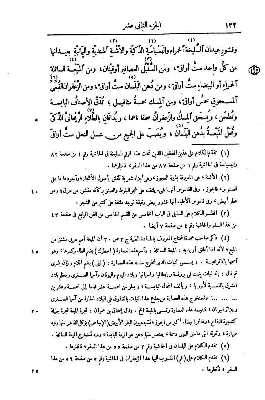 وقشور عيدان السّليخة «1» الحمراء والبسباسة «2» الذّكيّة والأشنة «3» الهنديّة واليمانيّة بعيدانها من كلّ واحد ستّ أواقىّ، ومن السّنبل «4» العصافير أوقيّتان، ومن الميعة «5» السائلة الحمراء أو البيضاء ستّ أواقىّ، ومن دهن البلسان «6» ستّ أواقىّ، ومن الزّعفران القمّىّ «7» المسحوق خمس أواقىّ، ومن المسك خمسة مثاقيل؛ تدقّ الأصناف اليابسة وتطحن، ويسحق المسك والزّعفران سحقا ناعما، ويدافان بالطّلاء «8» الرّيحانىّ الذّكىّ وتحلّ الميعة بدهن البلسان، ويصبّ على الجميع من عسل النحل ستّ أواقىّ