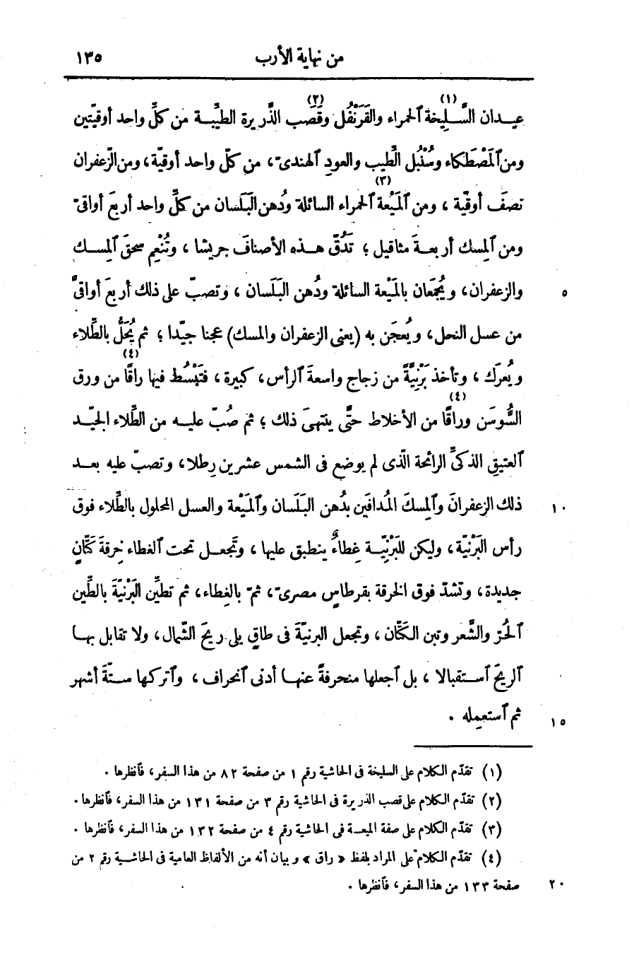 عيدان السّليخة «1» الحمراء والقرنفل وقصب «2» الذّريرة الطيّبة من كلّ واحد أوقيّتين ومن المصطكاء وسنبل الطّيب والعود الهندىّ، من كلّ واحد أوقيّة، ومن الزّعفران نصف أوقيّة، ومن الميعة «3» الحمراء السائلة ودهن البلسان من كلّ واحد أربع أواقىّ ومن المسك أربعة مثاقيل؛ تدقّ هذه الأصناف جريشا، وتنعم سحق المسك والزعفران، ويجمعان بالميعة السائلة ودهن البلسان، وتصبّ على ذلك أربع أواقىّ من عسل النحل، ويعجن به (يعنى الزعفران والمسك) عجنا جيّدا؛ ثم يحلّ بالطّلاء ويعرك، وتأخذ برنيّة من زجاج واسعة الرأس، كبيرة، فتبسط فيها راقا «4» من ورق السّوسن وراقا من الأخلاط حتّى ينتهى ذلك؛ ثم صبّ عليه من الطّلاء الجيّد العتيق الذكىّ الرائحة الّذى لم يوضع فى الشمس عشرين رطلا، وتصبّ عليه بعد ذلك الزعفران والمسك المدافين بدهن البلسان والميعة والعسل المحلول بالطّلاء فوق رأس البرنيّة، وليكن للبرنيّة غطاء ينطبق عليها، وتجعل تحت الغطاء خرقة كتّان جديدة، وتشدّ فوق الخرقة بقرطاس مصرىّ، ثمّ بالغطاء، ثم تطيّن البرنيّة بالطّين الحرّ والشّعر وتبن الكتّان، وتجعل البرنيّة فى طاق يلى ريح الشّمال، ولا تقابل بها الريح استقبالا، بل اجعلها منحرفة عنها أدنى انحراف، واتركها ستّة أشهر ثم استعمله.