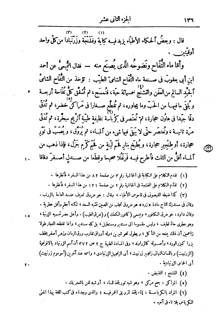 - فقال التّميمىّ عن أحمد ابن أبى يعقوب فى صنعة ماء التّفّاح الشامىّ الطيّب: تؤخذ من التّفّاح الشامىّ الجيّد السالم من العفن والتشنّج «4» خمسمائة حبّة، فتمسح، ثم تشقّق كلّ تفّاحة أربعة ويلقى ما فيها من الحبّ وما يجاوره، ثم تقطّع صغارا فى مراكن «5» خضر، ثم تدقّ دقّا جيّدا فى هاون حجارة، ثمّ تعتصر فى كرباسة «6» نظيفة طيّبة الرّيح مبخّرة، ثم تدقّ مرّة ثانية، وتعتصر حتّى لا يبقى فيها شىء من الماء، ثم يروّق، ويصبّ فى تور حجارة، أو طنجير حجارة، ويطبخ بنار فحم ليّنة من فحم كرم جزل، فإذا ذهب من الماء أقلّ من الثلث فاطرح فيه قرنفلا صحيحا وقطعا من صندل أصفر دقاقا
