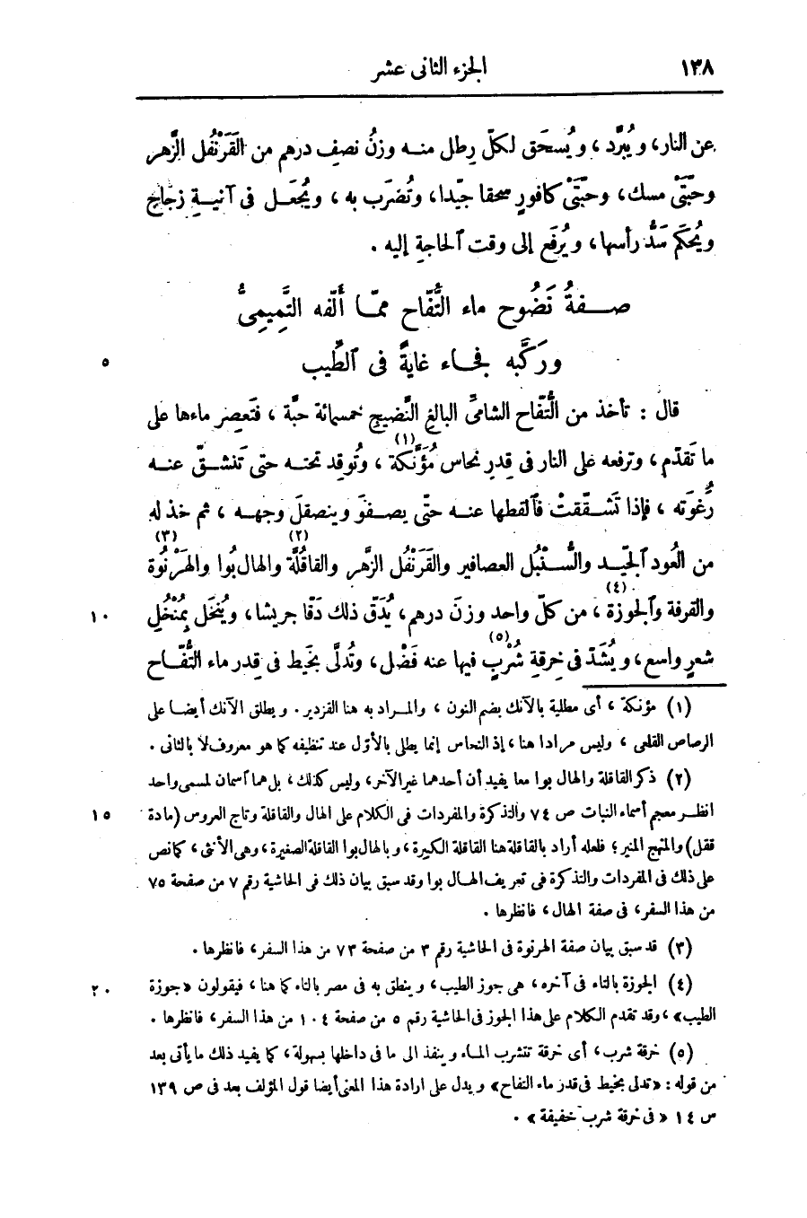 قال: تأخذ من التّفّاح الشامىّ البالغ النّضيج خمسمائة حبّة، فتعصر ماءها على ما تقدّم، وترفعه على النار فى قدر نحاس مؤنّكة «1» ، وتوقد تحته حتى تنشقّ عنه رغوته، فإذا تشقّقت فالقطها عنه حتّى يصفو وينصقل وجهه، ثم خذ له من العود الجيّد والسّنبل العصافير والقرنفل الزّهر والقاقلّة»