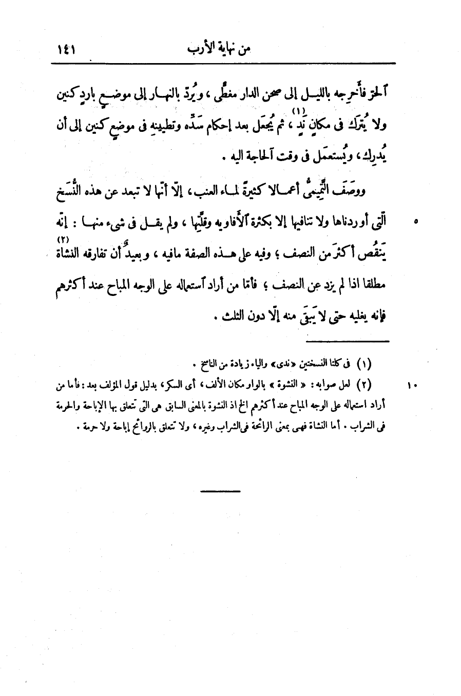 ووصف التّميمىّ أعمالا كثيرة لماء العنب، إلّا أنّها لا تبعد عن هذه النّسخ الّتى أوردناها ولا تنافيها إلا بكثرة الأفاويه وقلّتها، ولم يقل فى شىء منها: إنّه ينقص أكثر من النصف؛ وفيه على هذه الصفة ما فيه، وبعيد أن تفارقه النشاة «2» مطلقا اذا لم يزد عن النصف؛ فأمّا من أراد استعماله على الوجه المباح عند أكثرهم فإنه يغليه حتى لا يبقى منه إلّا دون الثلث.