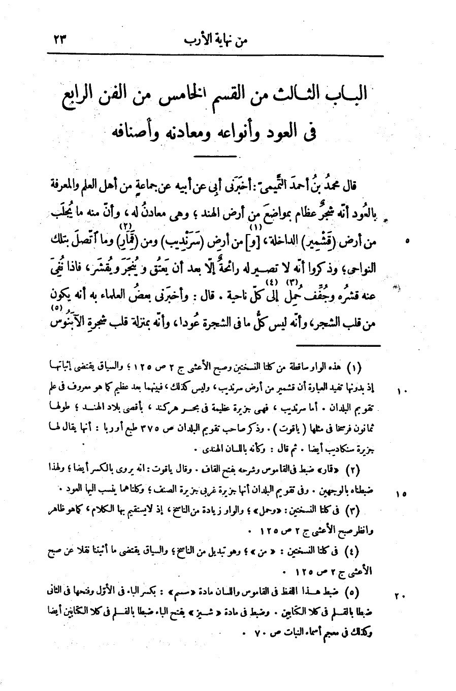 الباب الثالث من القسم الخامس من الفن الرابع فى العود وأنواعه ومعادنه وأصنافه