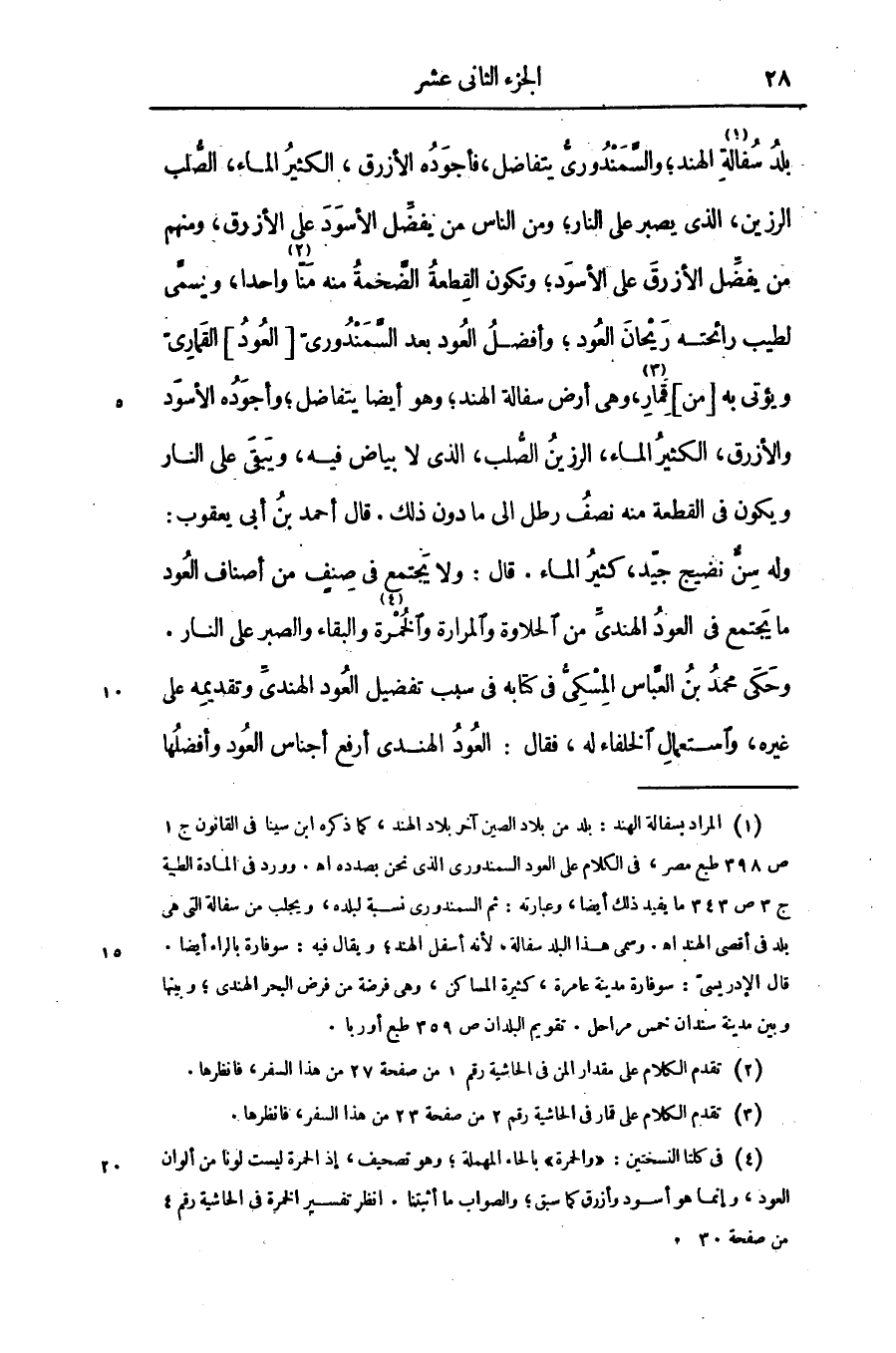 بلد سفالة «1» الهند؛ والسّمندورىّ يتفاضل، فأجوده الأزرق، الكثير الماء، الصّلب الرزين، الذى يصبر على النار؛ ومن الناس من يفضّل الأسود على الأزرق، ومنهم من يفضّل الأزرق على الأسود؛ وتكون القطعة الضّخمة منه منّا «2» واحدا، ويسمّى لطيب رائحته ريحان العود؛ وأفضل العود بعد السّمندورىّ [العود] القمارىّ ويؤتى به [من] قمار «3» ، وهى أرض سفالة الهند؛ وهو أيضا يتفاضل؛ وأجوده الأسود والأزرق، الكثير الماء، الرزين الصّلب، الذى لا بياض فيه، ويبقى على النار ويكون فى القطعة منه نصف رطل الى ما دون ذلك. قال أحمد بن أبى يعقوب: