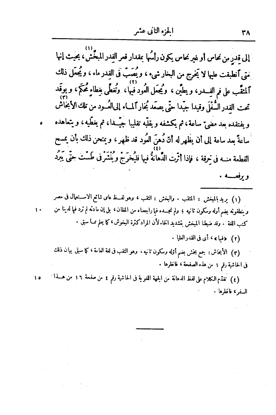 إلى قدر من نحاس أو غير نحاس يكون رأسها بمقدار قعر القدر المبخّش «1» ، بحيث إنها متى انطبقت عليها لا يخرج من البخار شىء، ويصبّ فى القدر ماء، ويجعل ذلك المثقّب على فم القدر، ويطيّن، ويجعل العود فيها «2» ، وتغطّى بغطاء محكم، ويوقد تحت القدر السّفلى وقيدا جيّدا حتّى يصعد بخار الماء إلى العود من تلك الأبخاش «3» ويفتقده بعد مضىّ ساعة، ثم يكشفه ويقلّبه تقليبا جيّدا، ثم يغطّيه، ويتعاهده ساعة بعد ساعة إلى أن يظهر له أنّ دهن العود قد ظهر، ويمتحن ذلك بأن يمسح القطعة منه فى خرقة، فإذا أثّرت الدّهانة «4» فيها فليخرج وينشر فى طست حتّى يبرد ويرفعه.