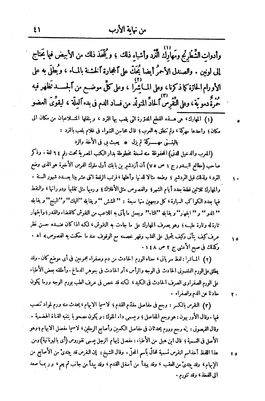 وأدوات الشّطرنج ومهارك «1» النّرد وأشباه ذلك؛ ويتّخذ ذلك من الأبيض فيما يحتاج إلى لونين. والصندل الأحمر أيضا يحكّ على الحجارة الخشنة بالماء، ويطلى به على الأورام الحارّة كما ذكرنا، وعلى الماشرا «2» ، وعلى كلّ موضع من الجسد تظهر فيه حمرة دمويّة، وعلى النّقرس «3» الحادّ المتولّد من فساد الدم فى بدء العلّة، ليقوّى العضو