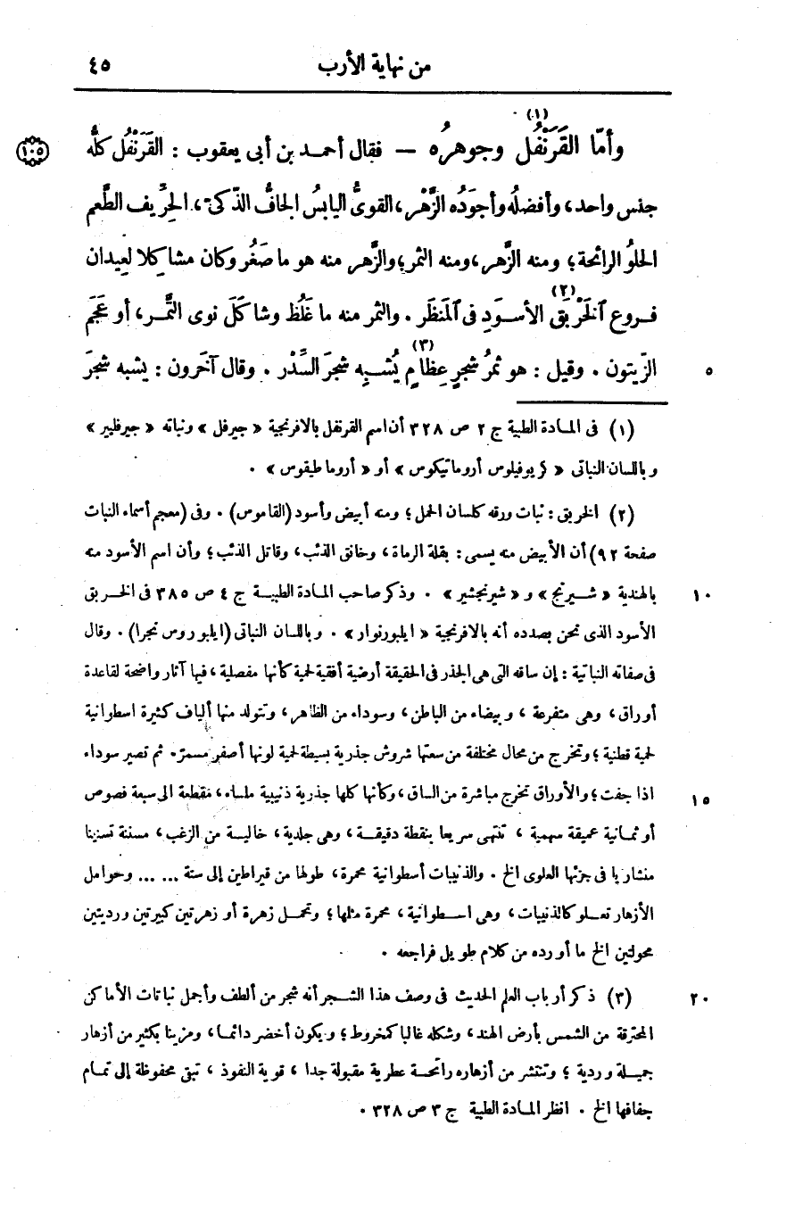 - فقال أحمد بن أبى يعقوب: القرنفل كلّه جنس واحد، وأفضله وأجوده الزّهر، القوىّ اليابس الجافّ الذّكىّ، الحرّيف الطّعم الحلو الرائحة؛ ومنه الزّهر، ومنه الثمر؛ والزّهر منه هو ما صغر وكان مشاكلا لعيدان فروع الخربق «2» الأسود فى المنظر. والثمر منه ما غلظ وشاكل نوى التّمر، أو عجم الزّيتون. وقيل: هو ثمر شجر عظام «3» يشبه شجر السّدر. وقال آخرون: يشبه شجر