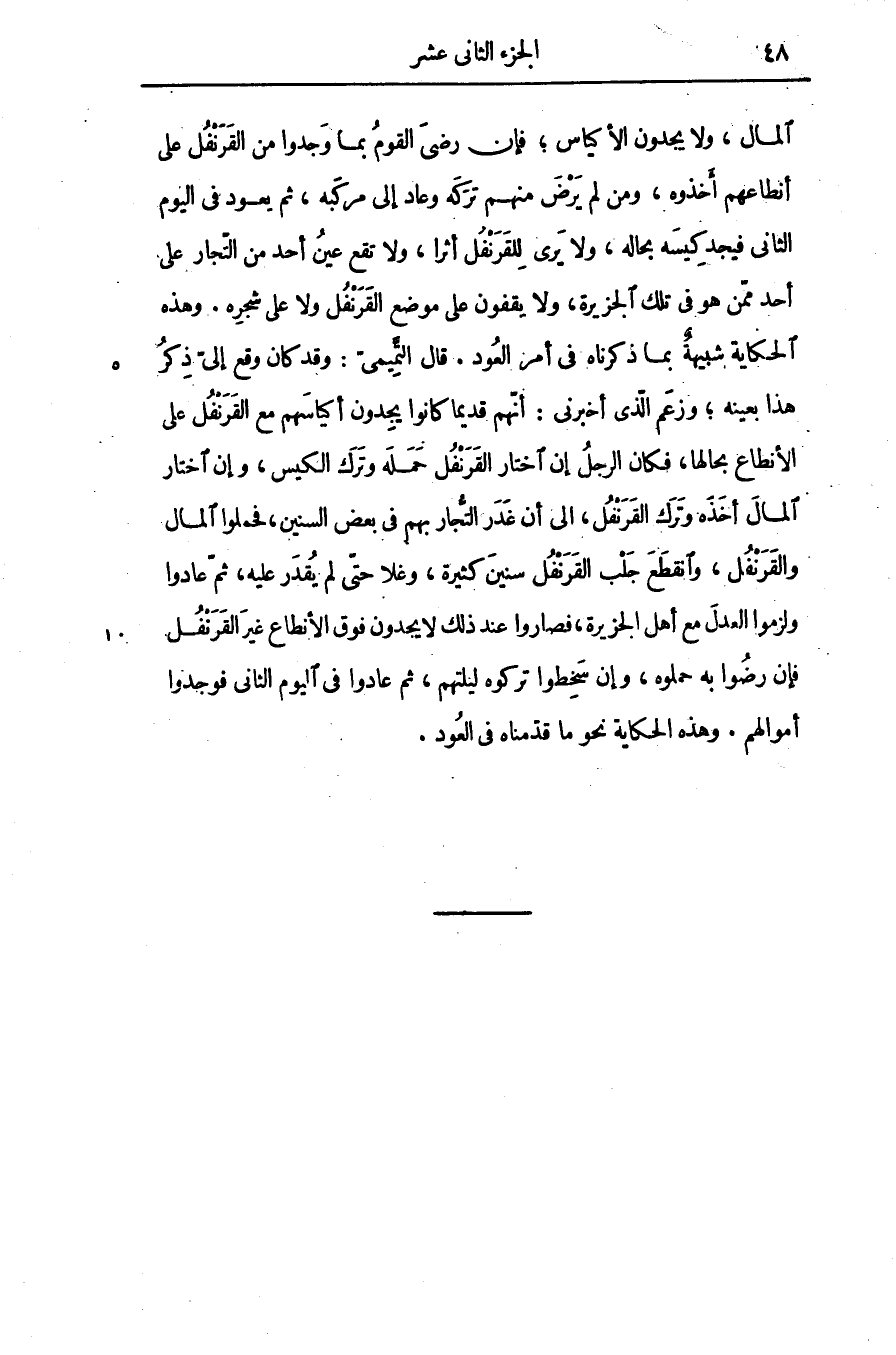 المال، ولا يجدون الأكياس؛ فإن رضى القوم بما وجدوا من القرنفل على أنطاعهم أخذوه، ومن لم يرض منهم تركه وعاد إلى مركبه، ثم يعود فى اليوم الثانى فيجد كيسه بحاله، ولا يرى للقرنفل أثرا، ولا تقع عين أحد من التّجار على أحد ممّن هو فى تلك الجزيرة، ولا يقفون على موضع القرنفل ولا على شجره. وهذه الحكاية شبيهة بما ذكرناه فى أمر العود. قال التّميمىّ: وقد كان وقع إلىّ ذكر هذا بعينه؛ وزعم الّذى أخبرنى: أنّهم قديما كانوا يجدون أكياسهم مع القرنفل على الأنطاع بحالها، فكان الرجل إن اختار القرنفل حمله وترك الكيس، وإن اختار المال أخذه وترك القرنفل، الى أن غدر التّجار بهم فى بعض السنين، فحملوا المال والقرنفل، وانقطع جلب القرنفل سنين كثيرة، وغلا حتّى لم يقدر عليه، ثمّ عادوا ولزموا العدل مع أهل الجزيرة، فصاروا عند ذلك لا يجدون فوق الأنطاع غير القرنفل فإن رضوا به حملوه، وإن سخطوا تركوه ليلتهم، ثم عادوا فى اليوم الثانى فوجدوا أموالهم. وهذه الحكاية نحو ما قدّمناه فى العود.