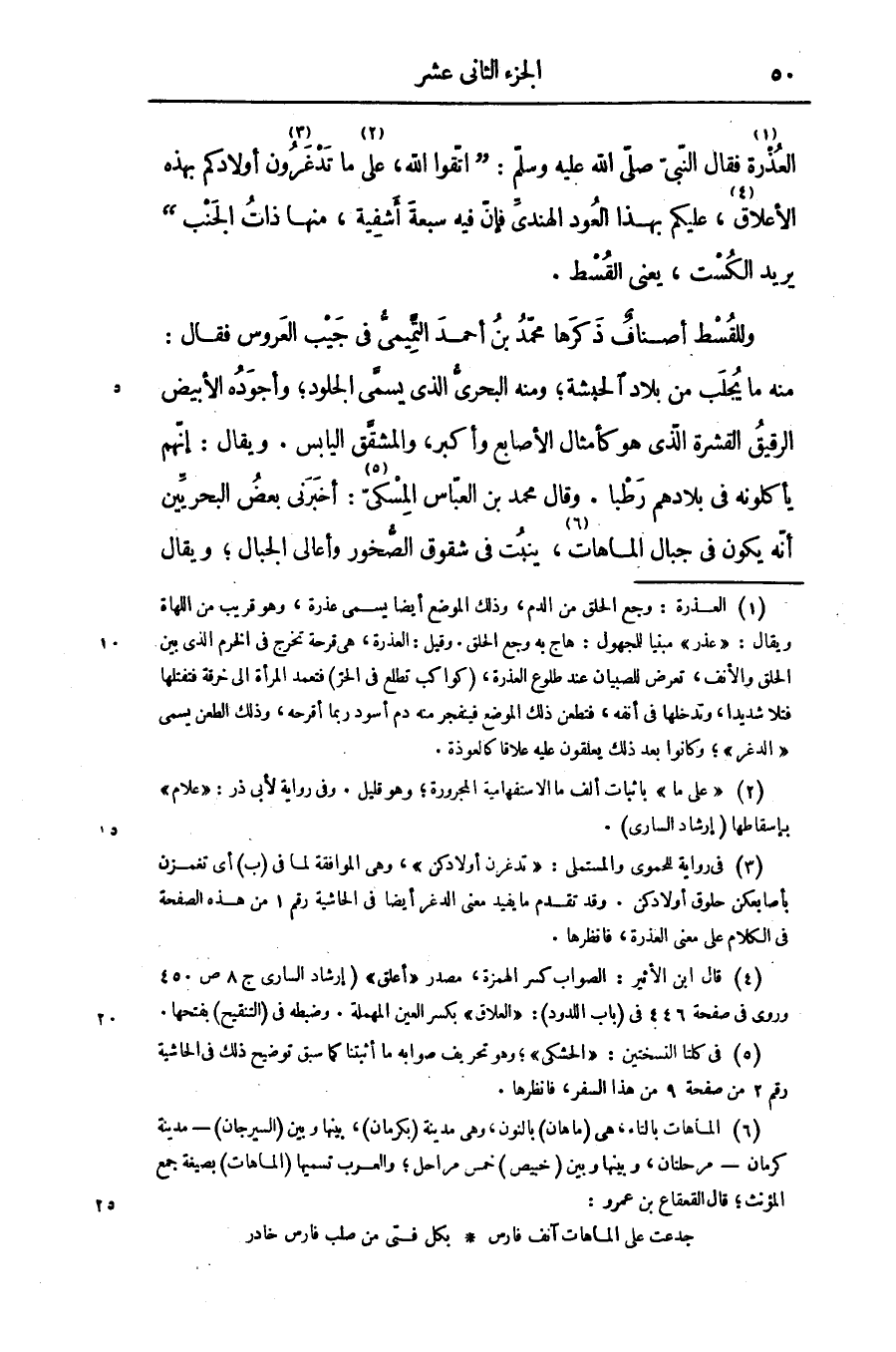 العذرة «1» فقال النّبىّ صلّى الله عليه وسلّم: «اتّقوا الله، على «2» ما تدغرون «3» أولادكم بهذه الأعلاق «4» ، عليكم بهذا العود الهندىّ فإنّ فيه سبعة أشفية، منها ذات الجنب» يريد الكست، يعنى القسط.