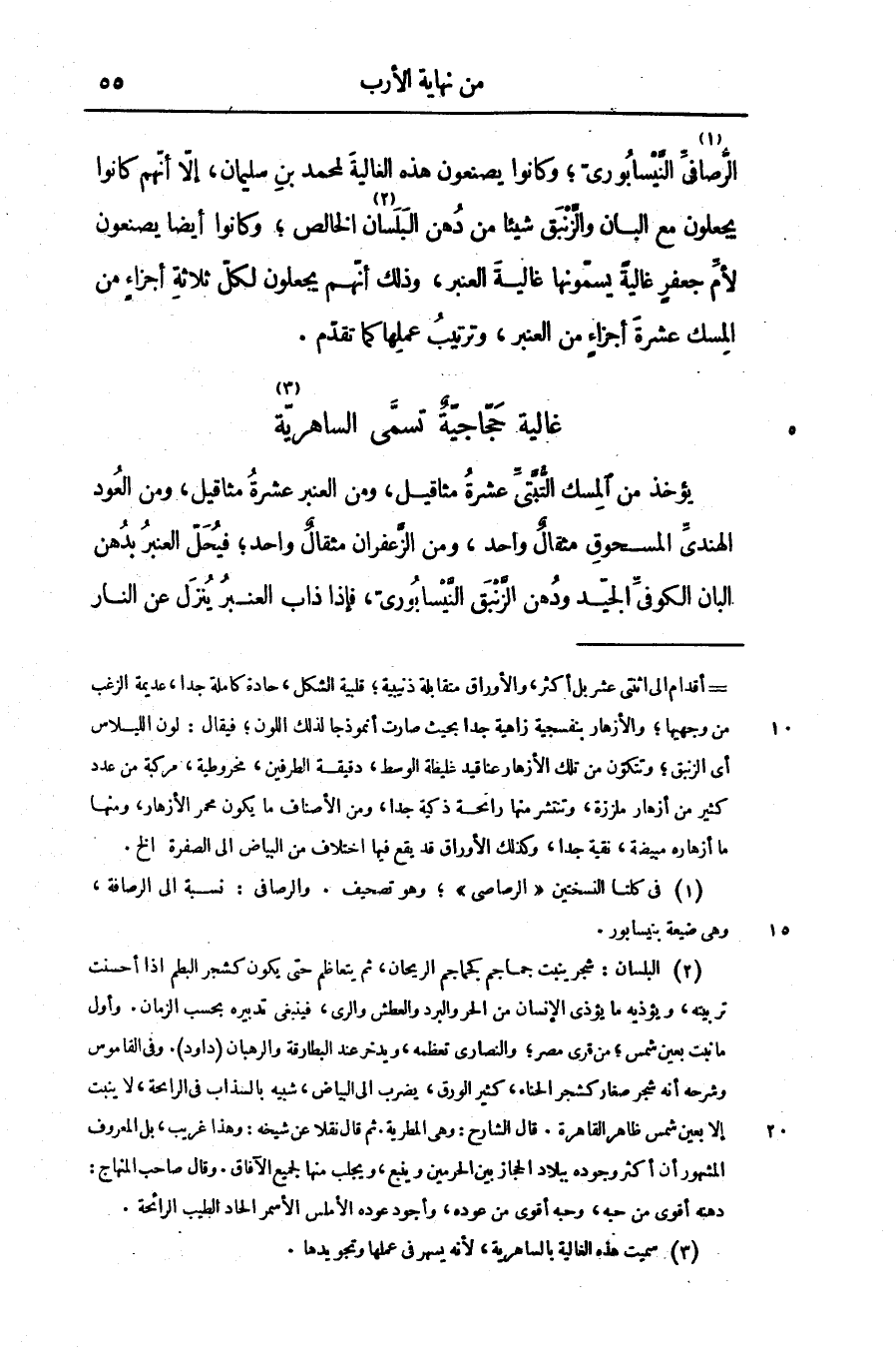 الرّصافىّ «1» النّيسابورىّ؛ وكانوا يصنعون هذه الغالية لمحمد بن سليمان، إلّا أنّهم كانوا يجعلون مع البان والزّنبق شيئا من دهن البلسان «2» الخالص؛ وكانوا أيضا يصنعون لأمّ جعفر غالية يسمّونها غالية العنبر، وذلك أنّهم يجعلون لكلّ ثلاثة أجزاء من المسك عشرة أجزاء من العنبر، وترتيب عملها كما تقدّم.