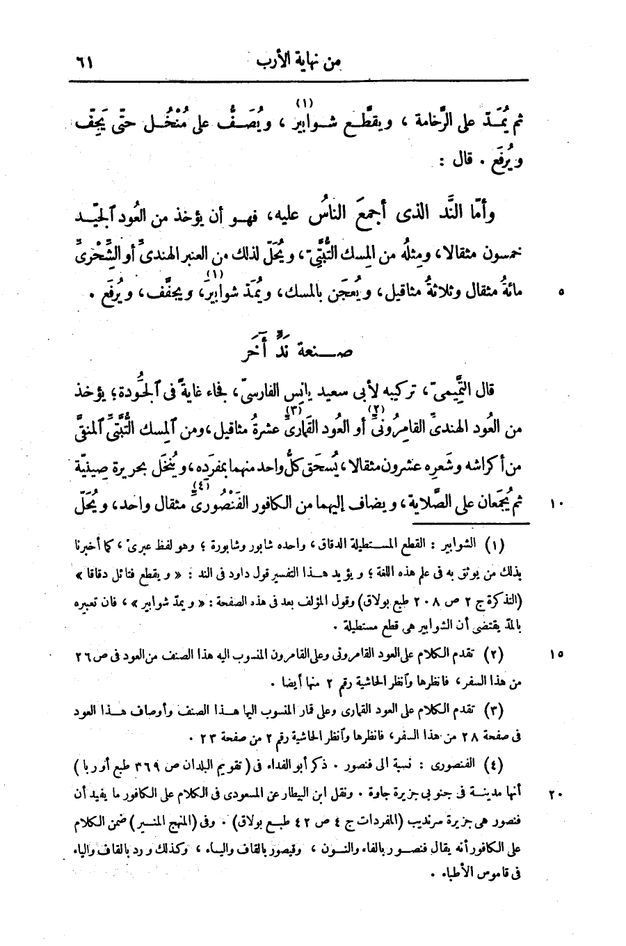 وأمّا النّد الذى أجمع الناس عليه، فهو أن يؤخذ من العود الجيّد خمسون مثقالا، ومثله من المسك التّبّتىّ، ويحلّ لذلك من العنبر الهندىّ أو الشّحرىّ مائة مثقال وثلاثة مثاقيل، ويعجن بالمسك، ويمدّ شوابير، ويجفّف، ويرفع.