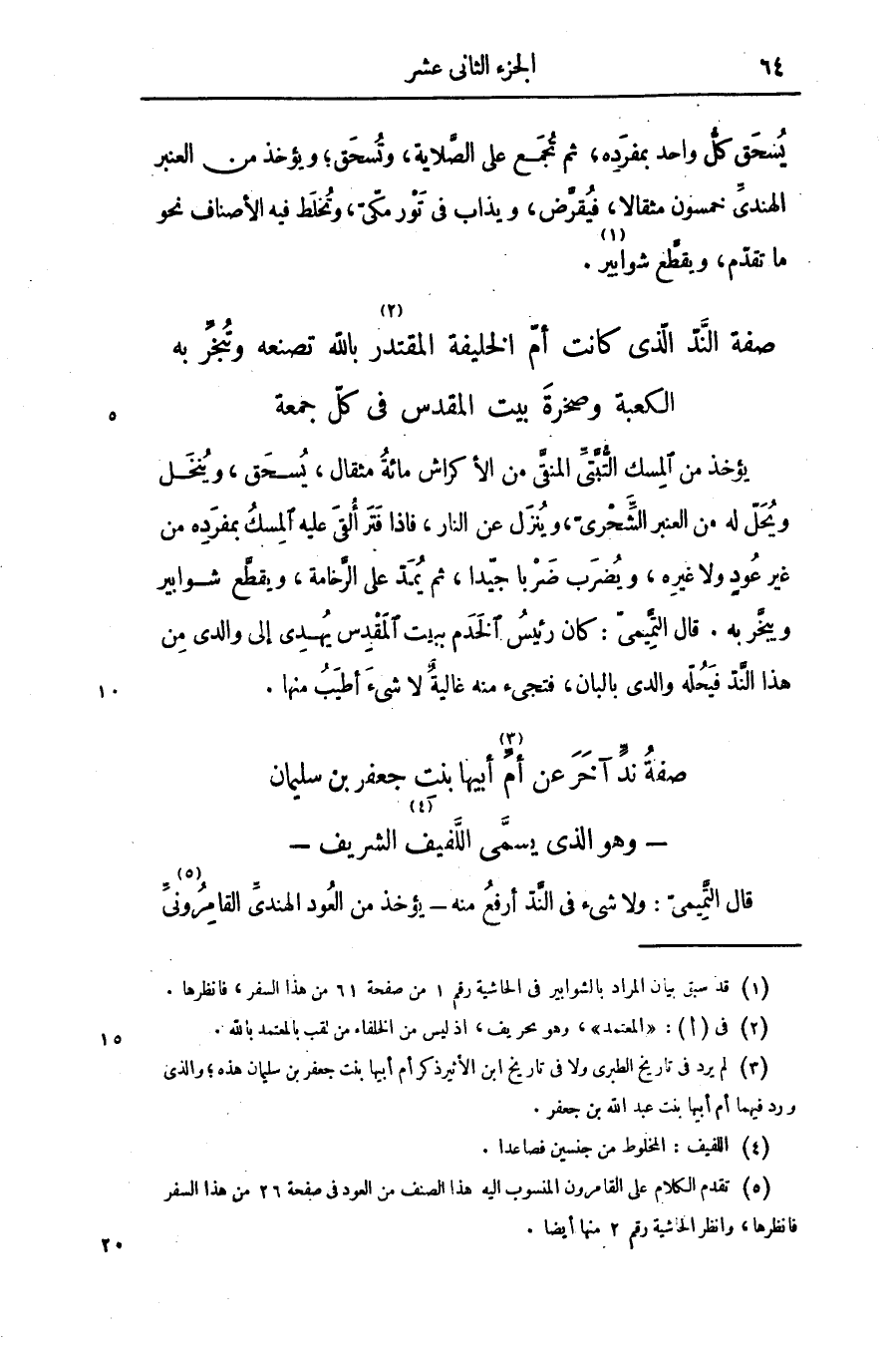 صفة النّدّ الّذى كانت أمّ الخليفة المقتدر «2» بالله تصنعه وتبخّر به الكعبة وصخرة بيت المقدس فى كلّ جمعة