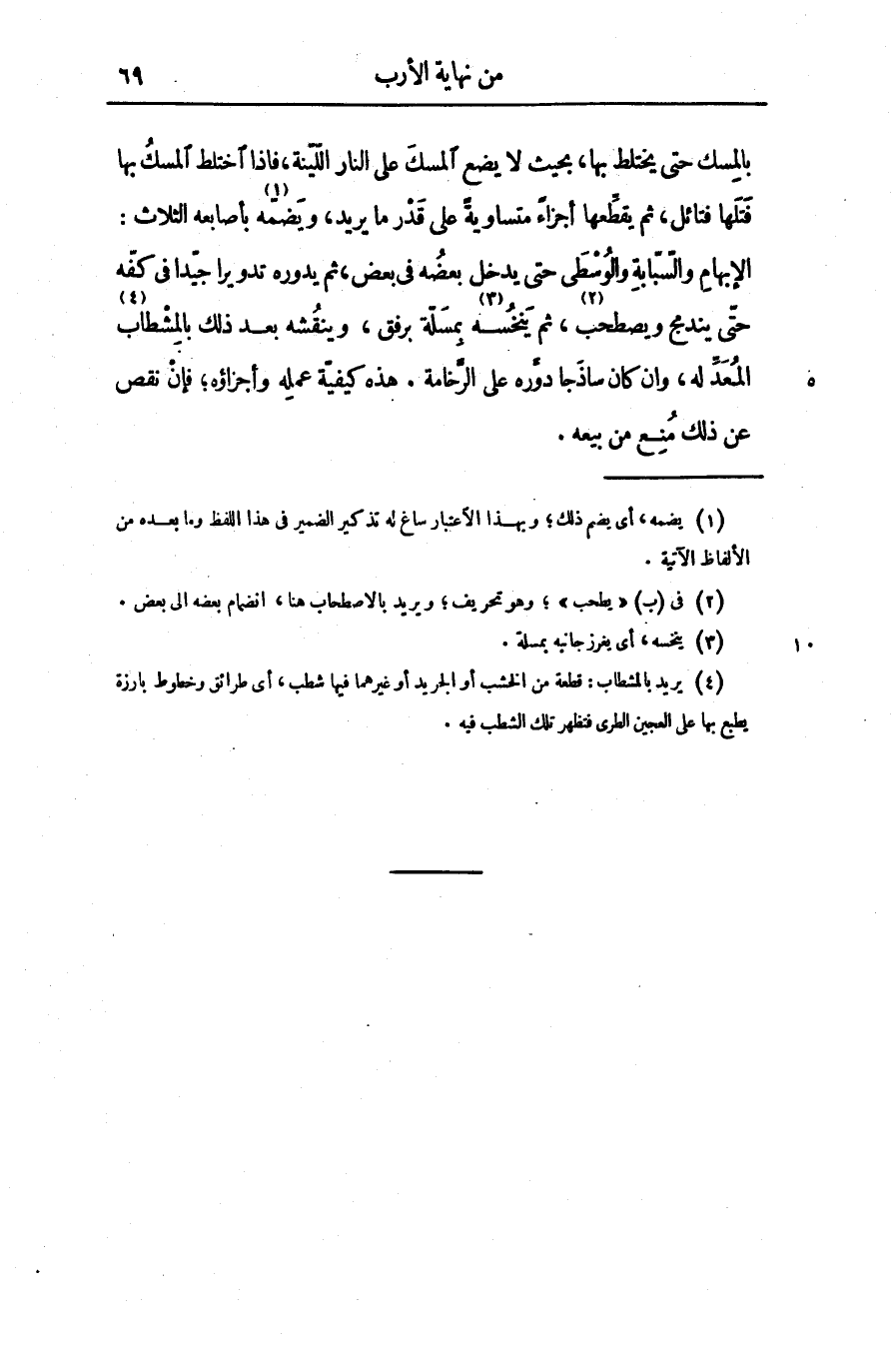 الإبهام والسّبّابة والوسطى حتى يدخل بعضه فى بعض، ثم يدوره تدويرا جيّدا فى كفّه حتّى يندمج ويصطحب «2» ، ثم ينخسه «3» بمسلّة برفق، وينقشه بعد ذلك بالمشطاب «4» المعدّله، وان كان ساذجا دوّره على الرّخامة. هذه كيفيّة عمله وأجزاؤه؛ فإن نقص عن ذلك منع من بيعه.