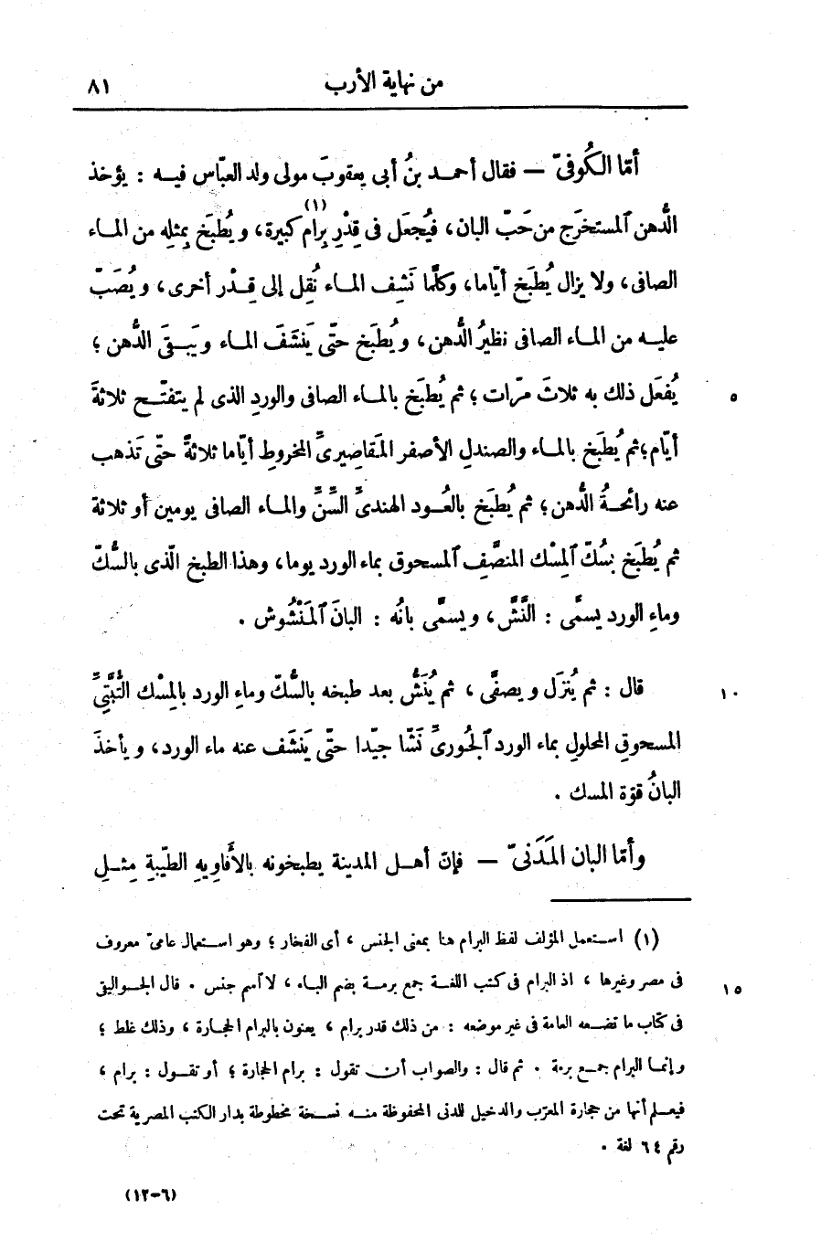 - فقال أحمد بن أبى يعقوب مولى ولد العبّاس فيه: يؤخذ الدّهن المستخرج من حبّ البان، فيجعل فى قدر برام «1» كبيرة، ويطبخ بمثله من الماء الصافى، ولا يزال يطبخ أيّاما، وكلّما نشف الماء نقل إلى قدر أخرى، ويصبّ عليه من الماء الصافى نظير الدّهن، ويطبخ حتّى ينشف الماء ويبقى الدّهن؛ يفعل ذلك به ثلاث مرّات؛ ثم يطبخ بالماء الصافى والورد الذى لم يتفتّح ثلاثة أيّام؛ ثم يطبخ بالماء والصندل الأصفر المقاصيرىّ المخروط أيّاما ثلاثة حتّى تذهب عنه رائحة الدّهن؛ ثم يطبخ بالعود الهندىّ السّنّ والماء الصافى يومين أو ثلاثة ثم يطبخ بسكّ المسك المنصّف المسحوق بماء الورد يوما، وهذا الطبخ الّذى بالسّكّ وماء الورد يسمّى: النّشّ، ويسمّى بانه: البان المنشوش.