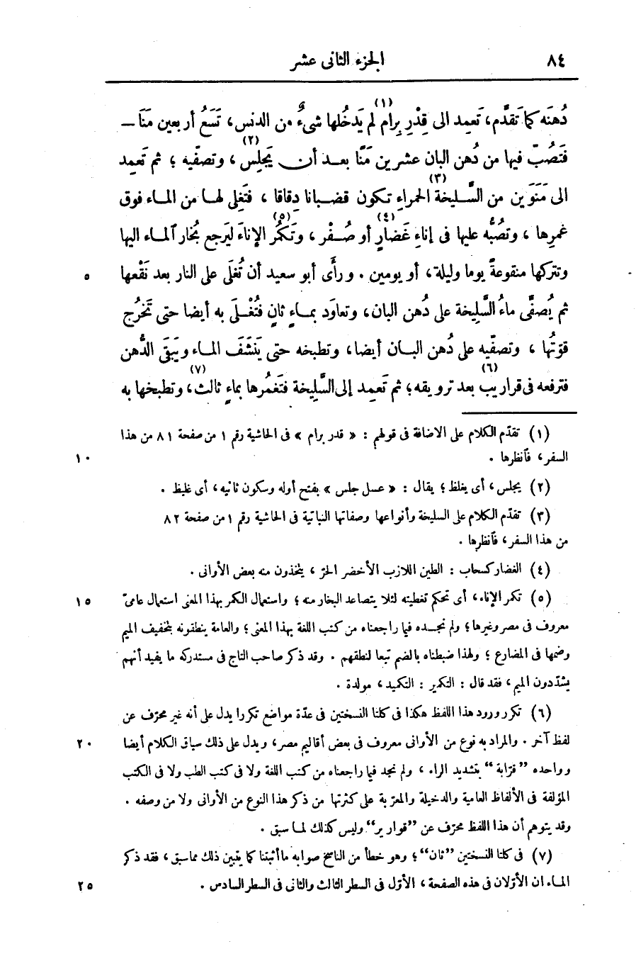 دهنه كما تقدّم، تعمد الى قدر برام «1» لم يدخلها شىء من الدنس، تسع أربعين منا- فتصبّ فيها من دهن البان عشرين منّا بعد أن يجلس «2» ، وتصفّيه؛ ثم تعمد الى منوين من السّليخة «3» الحمراء تكون قضبانا دقاقا، فتغلى لها من الماء فوق غمرها، وتصبّه عليها فى إناء غضار «4» أو صفر، وتكمر «5» الإناء ليرجع بخار الماء اليها وتتركها منقوعة يوما وليلة، أو يومين. ورأى أبو سعيد أن تغلى على النار بعد نقعها ثم يصفّى ماء السّليخة على دهن البان، وتعاود بماء ثان فتغلى به أيضا حتى تخرج قوّتها، وتصفّيه على دهن البان أيضا، وتطبخه حتى ينشف الماء ويبقى الدّهن فترفعه فى قراريب «6» بعد ترويقه؛ ثم تعمد إلى السّليخة فتغمرها بماء ثالث «7» ، وتطبخها به