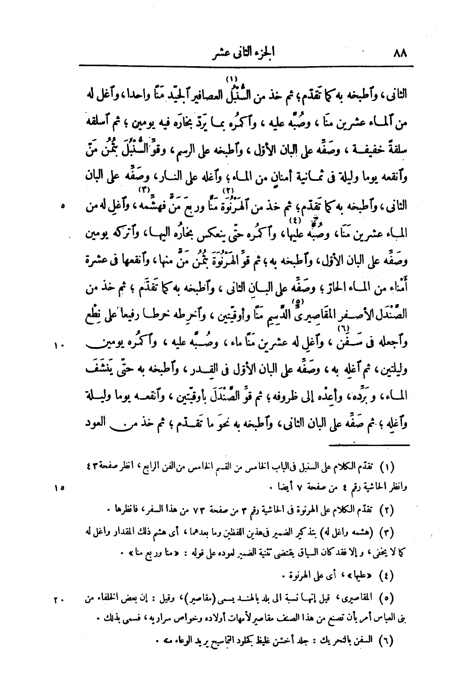 الثانى، واطبخه به كما تقدّم؛ ثم خذ من السّنبل «1» العصافير الجيّد منا واحدا، واغل له من الماء عشرين منا، وصبّه عليه، واكمره بما يردّ بخاره فيه يومين؛ ثم اسلقه سلقة خفيفة، وصفّه على البان الأوّل، واطبخه على الرسم، وقوّ السّنبل بثمن منّ وانقعه يوما وليلة فى ثمانية أمنان من الماء؛ واغله على النار، وصفّه على البان الثانى، واطبخه به كما تقدّم؛ ثم خذ من الهرنوة «2» منّا وربع منّ فهشّمه «3» ، واغل له من الماء عشرين منا، وصبّه عليها «4» ، واكمره حتّى ينعكس بخاره اليها، واتركه يومين وصفّه على البان الأوّل، واطبخه به؛ ثم قوّ الهرنوة بثمن منّ منها، وانقعها فى عشرة أمناء من الماء الحارّ؛ وصفّه على البان الثانى، واطبخه به كما تقدّم؛ ثم خذ من الصّندل الأصفر المقاصيرىّ «5» الدّسم منا وأوقيّتين، واخرطه خرطا رفيعا على نطع واجعله فى سفن «6» ، واغل له عشرين منا ماء، وصبّه عليه، واكمره يومين وليلتين، ثم اغله به، وصفّه على البان الأوّل فى القدر، واطبخه به حتّى ينشف الماء، وبرّده، وأعده إلى ظروفه؛ ثم قوّ الصّندل بأوقيّتين، وانقعه يوما وليلة واغله؛ ثم صفّه على البان الثانى، واطبخه به نحو ما تقدّم؛ ثم خذ من العود