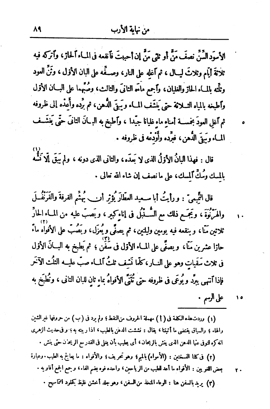 الأسود السّنّ نصف منّ أو ثلثى منّ إن أحببت فانقعه فى الماء الحارّ، واتركه فيه ثلاثة أيّام وثلاث ليال، ثم اغله على النار، وصفّه على البان الأوّل، وثنّ العود وثلّثه بالماء الحارّ والغليان، واجمع ماءه الثانى والثالث، وصبّهما على البان الأوّل واطبخه بالمياه الثلاثة حتى ينشف الماء ويبقى الدّهن، ثم برّده وأعده إلى ظروفه ثم اغل العود بخمسة أمناء ماء غليانا جيّدا، واطبخ به البان الثانى حتّى ينشف الماء ويبقى الدّهن، فبرّده وأودعه فى ظروفه.