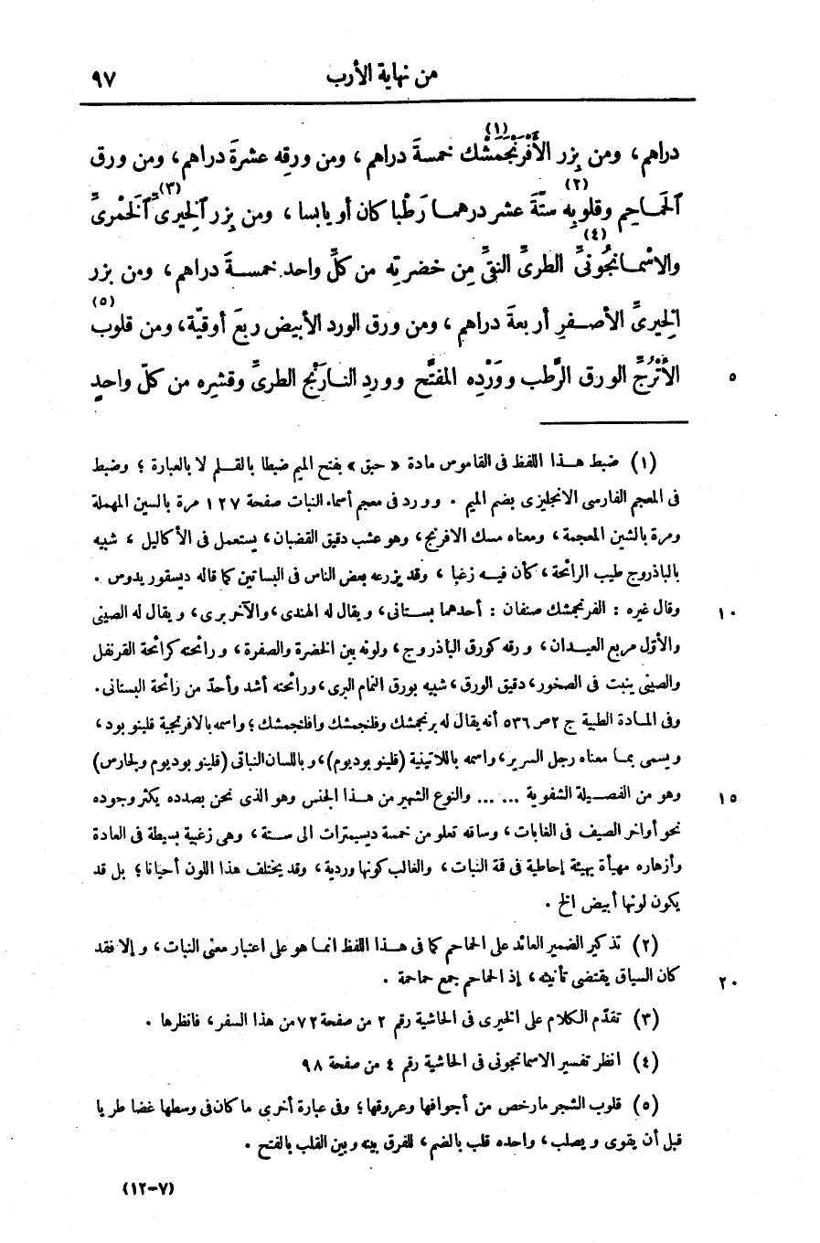 دراهم، ومن بزر الأفرنجمشك «1» خمسة دراهم، ومن ورقه عشرة دراهم، ومن ورق الحماحم وقلوبه «2» ستّة عشر درهما رطبا كان أو يابسا، ومن بزر الخيرى «3» الخمرىّ والاسمانجونىّ «4» الطرىّ النقىّ من خضرته من كلّ واحد خمسة دراهم، ومن بزر الخيرىّ الأصفر أربعة دراهم، ومن ورق الورد الأبيض ربع أوقيّة، ومن قلوب «5» الأترجّ الورق الرّطب وورده المفتّح وورد النارنج الطرىّ وقشره من كلّ واحد