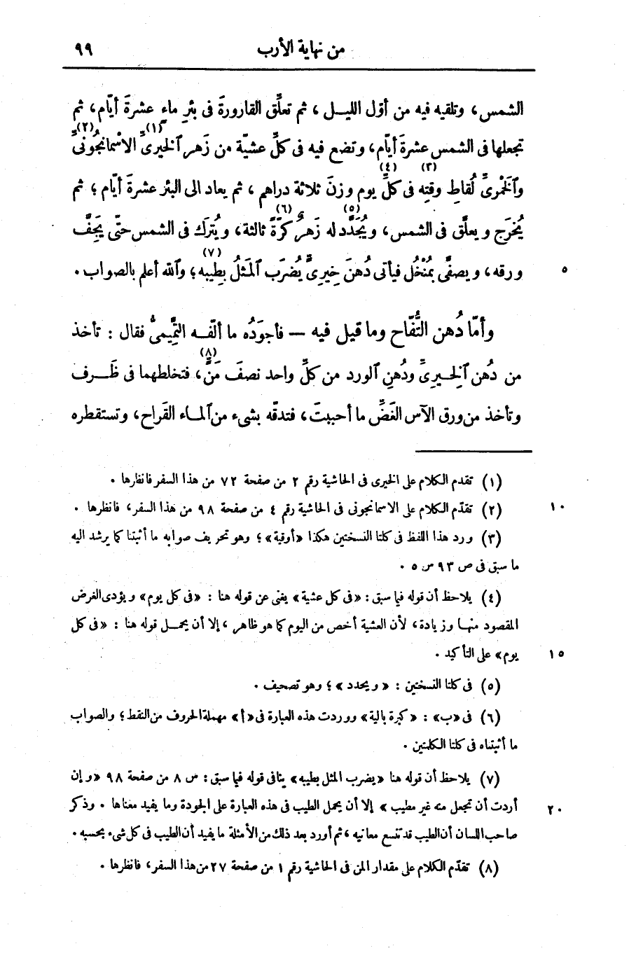الشمس، وتلقيه فيه من أوّل الليل، ثم تعلّق القارورة فى بئر ماء عشرة أيّام، ثم تجعلها فى الشمس عشرة أيّام، وتضع فيه فى كلّ عشيّة من زهر الخيرىّ «1» الاسمانجونىّ «2» والخمرىّ لقاط وقته «3» فى كلّ «4» يوم وزن ثلاثة دراهم، ثم يعاد الى البئر عشرة أيّام؛ ثم يخرج ويعلّق فى الشمس، ويجدّد «5» له زهر كرّة «6» ثالثة، ويترك فى الشمس حتّى يجفّ ورقه، ويصفّى بمنخل فيأتى دهن خيرىّ يضرب المثل بطيبه «7» ؛ والله أعلم بالصواب.