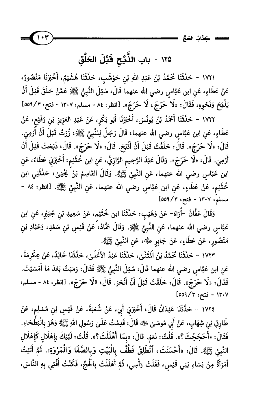 1721 - حَدَّثَنَا مُحَمَّدُ بْنُ عَبْدِ اللهِ بْنِ حَوْشَبٍ، حَدَّثَنَا هُشَيْمٌ، أَخْبَرَنَا مَنْصُورٌ، عَنْ عَطَاءٍ، عَنِ ابْنِ عَبَّاسٍ رضي الله عنهما قَالَ: سُئِلَ النَّبِيُّ - صلى الله عليه وسلم - عَمَّنْ حَلَقَ قَبْلَ أَنْ يَذْبَحَ وَنَحْوِهِ، فَقَالَ: "لاَ حَرَجَ، لاَ حَرَجَ". [انظر: 84 - مسلم: 1307 - فتح: 3/ 559]