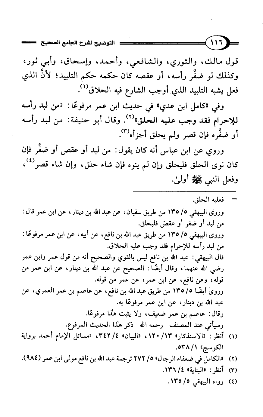 وروى البيهقي 5/ 135 من طريق سفيان، عن عبد الله بن دينار، عن ابن عمر قال: من لبد أو ضفر أو عقصَ فليحلق.