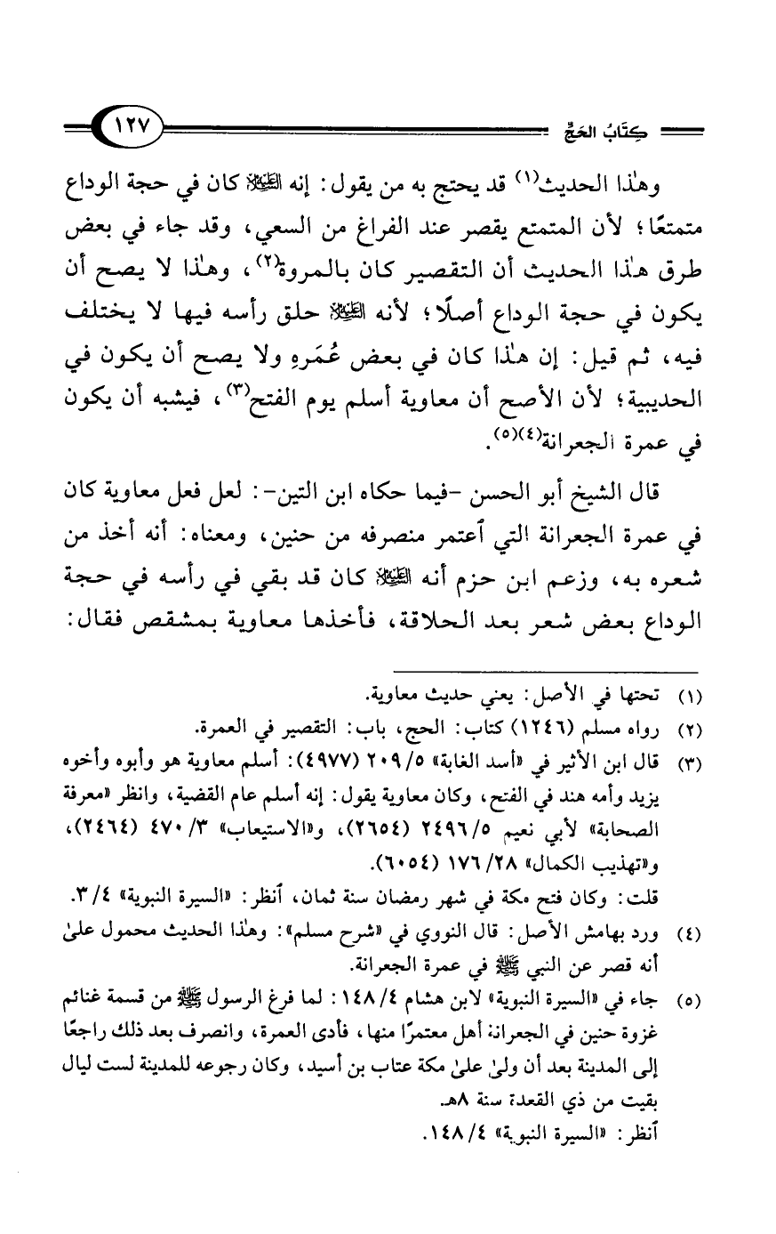(¬4) ورد بهامش الأصل: قال النووي في "شرح مسلم": وهذا الحديث محمول على أنه قصر عن النبي - صلى الله عليه وسلم - في عمرة الجعرانة.