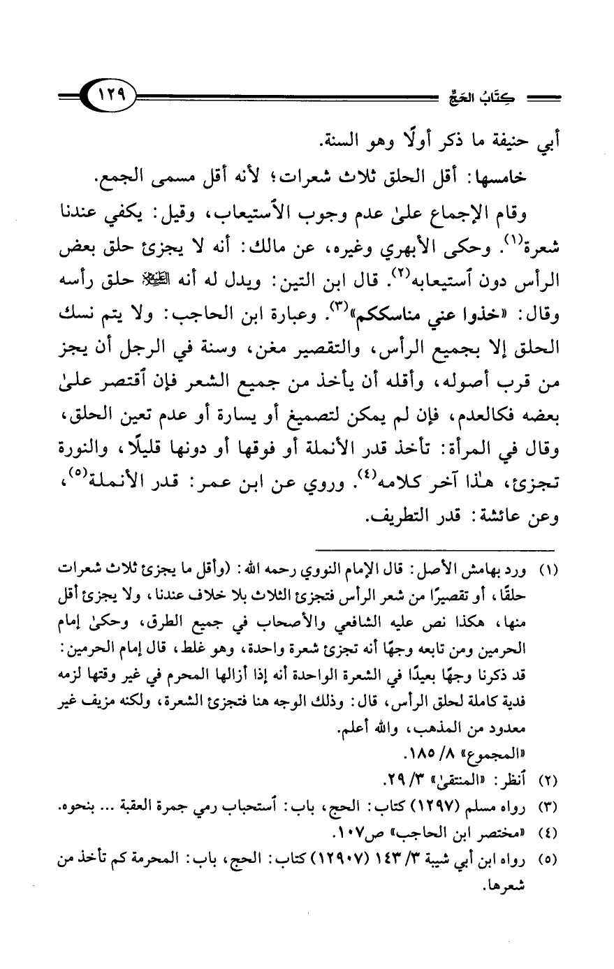(¬1) ورد بهامش الأصل: قال الإمام النووي رحمه الله: (وأقل ما يجزئ ثلاث شعرات حلقًا، أو تقصيرًا من شعر الرأس فتجزئ الثلاث بلا خلاف عندنا، ولا يجزئ أقل منها، هكذا نص عليه الشافعي والأصحاب في جميع الطرق، وحكى إمام الحرمين ومن تابعه وجهًا أنه تجزئ شعرة واحدة، وهو غلط، قال إمام الحرمين: قد ذكرنا وجهًا بعيدًا في الشعرة الواحدة أنه إذا أزالها المحرم في غير وقتها لزمه فدية كاملة لحلق الرأس، قال: وذلك الوجه هنا فتجزئ الشعرة، ولكنه مزيف غير معدود من المذهب، والله أعلم.