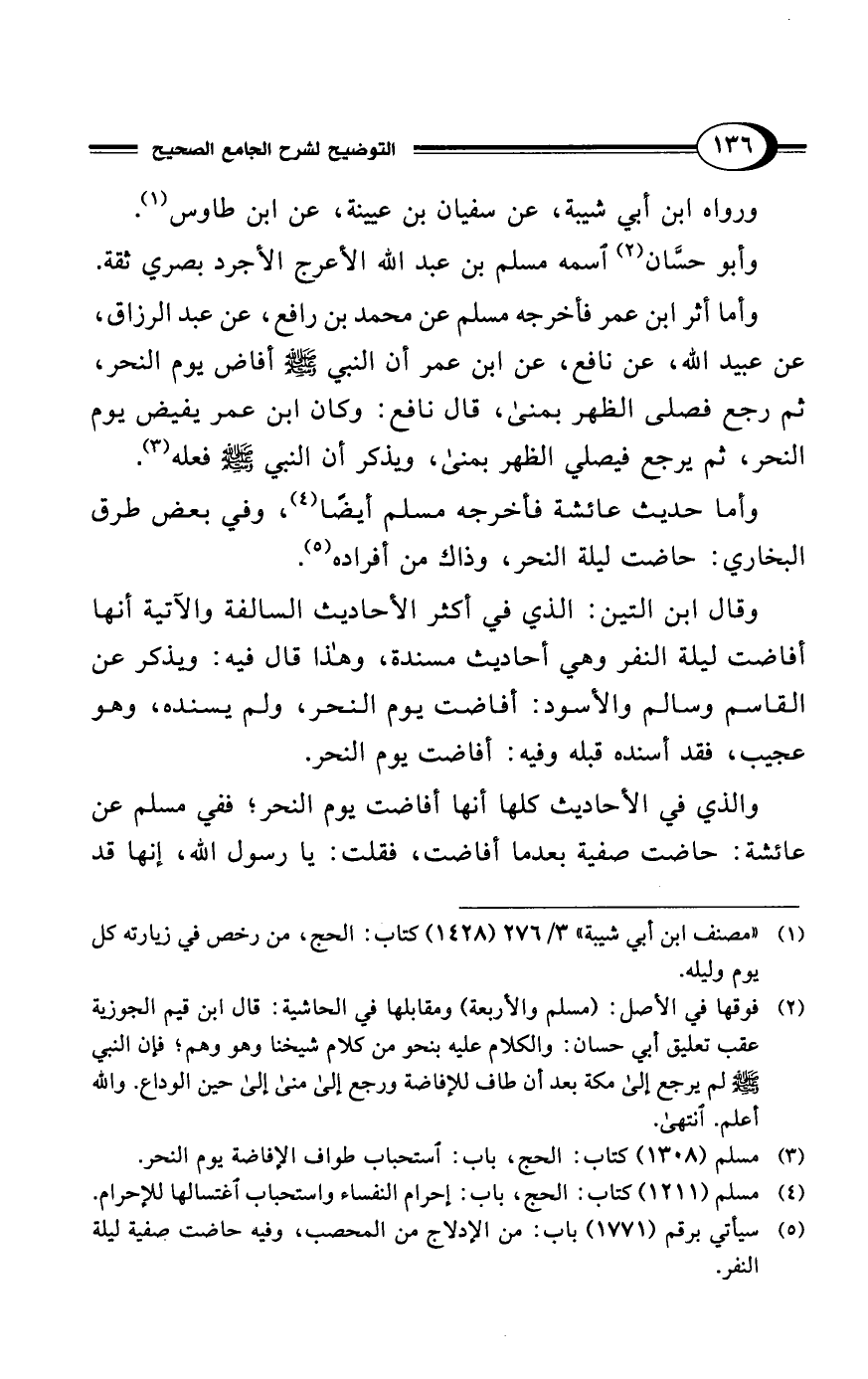 (¬2) فوقها في الأصل: (مسلم والأربعة) ومقابلها في الحاشية: قال ابن قيم الجوزية عقب تعليق أبي حسان: والكلام عليه بنحو من كلام شيخنا وهو وهم؛ فإن النبي - صلى الله عليه وسلم - لم يرجع إلى مكة بعد أن طاف للإفاضة ورجع إلى منى إلى حين الوداع. والله أعلم. انتهى.