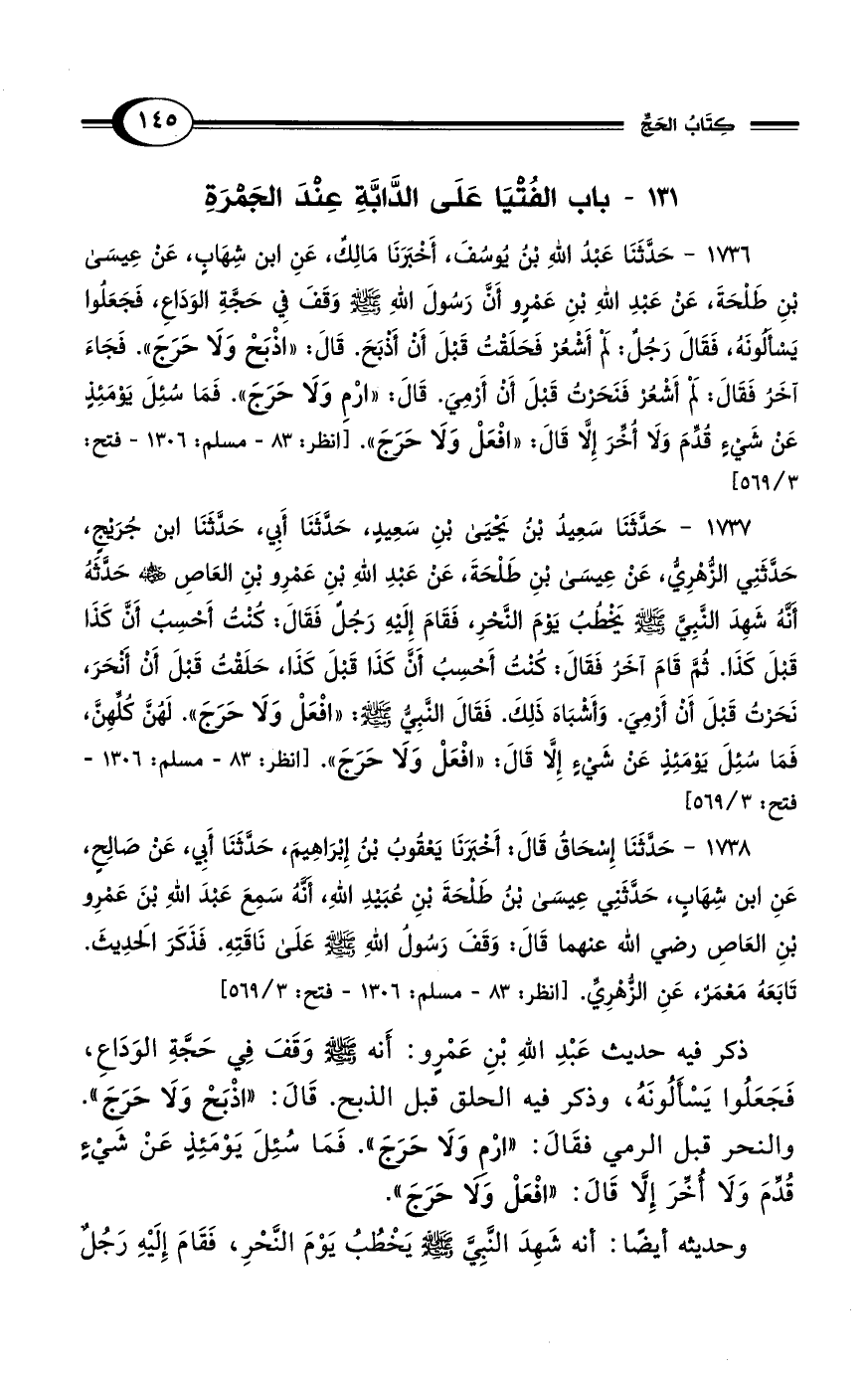 1738 - حَدَّثَنَا إِسْحَاقُ قَالَ: أَخْبَرَنَا يَعْقُوبُ بْنُ إِبْرَاهِيمَ، حَدَّثَنَا أَبِي، عَنْ صَالِحٍ، عَنِ ابْنِ شِهَابٍ، حَدَّثَنِي عِيسَى بْنُ طَلْحَةَ بْنِ عُبَيْدِ اللهِ، أَنَّهُ سَمِعَ عَبْدَ اللهِ بْنَ عَمْرِو بْنِ العَاصِ رضي الله عنهما قَالَ: وَقَفَ رَسُولُ اللهِ - صلى الله عليه وسلم - عَلَى نَاقَتِهِ. فَذَكَرَ الحَدِيثَ. تَابَعَهُ مَعْمَرٌ عَنِ الزُّهْرِيِّ. [انظر: 83 - مسلم: 1306 - فتح: 3/ 569]