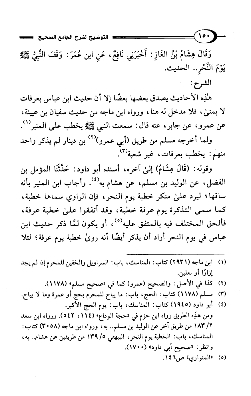 وَقَالَ هِشَامُ بْنُ الغَازِ: أَخْبَرَنِي نَافِعٌ، عَنِ ابن عُمَرَ: وَقَفَ النَّبِيُّ - صلى الله عليه وسلم - يَوْمَ النَّحْرِ .. الحديث.