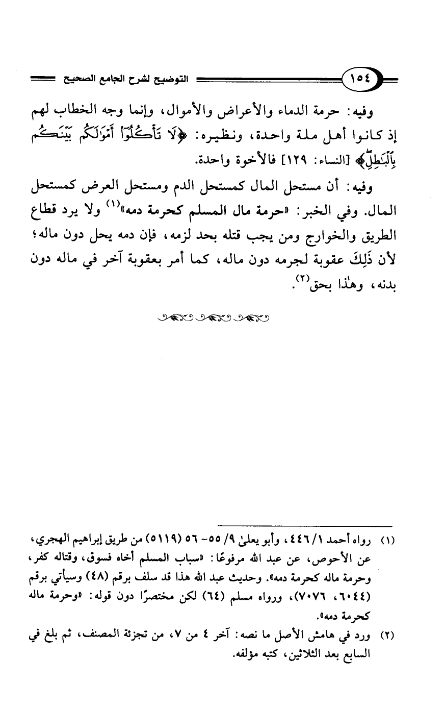 وفيه: حرمة الدماء والأعراض والأموال، وإنما وجه الخطاب لهم إذ كانوا أهل ملة واحدة، ونظيره: {وَلَا تَأْكُلُوا أَمْوَالَكُمْ بَيْنَكُمْ بِالبَاطِلِ} [النساء: 129] فالأخوة واحدة.