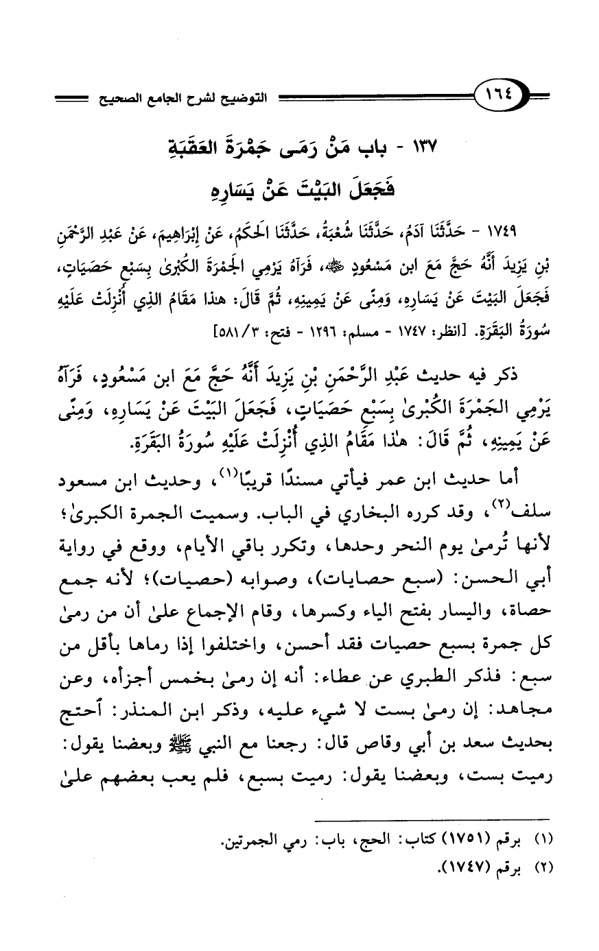 1749 - حَدَّثَنَا آدَمُ، حَدَّثَنَا شُعْبَةُ، حَدَّثَنَا الحَكَمُ، عَنْ إِبْرَاهِيمَ، عَنْ عَبْدِ الرَّحْمَنِ بْنِ يَزِيدَ أَنَّهُ حَجَّ مَعَ ابْنِ مَسْعُودٍ - رضي الله عنه -، فَرَآهُ يَرْمِي الجَمْرَةَ الكُبْرَى بِسَبْعِ حَصَيَاتٍ، فَجَعَلَ البَيْتَ عَنْ يَسَارِهِ، وَمِنًى عَنْ يَمِينِهِ، ثُمَّ قَالَ: هَذَا مَقَامُ الذِي أُنْزِلَتْ عَلَيْهِ سُورَةُ البَقَرَةِ. [انظر: 1747 - مسلم: 1296 - فتح: 3/ 581]
