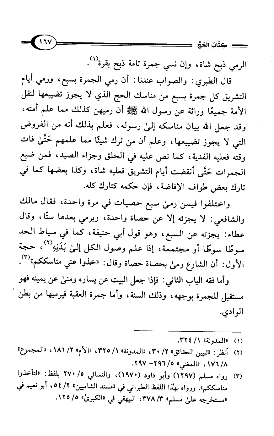 قال الطبري: والصواب عندنا: أن رمي الجمرة بسبع، ورمي أيام التشريق كل جمرة بسبع من مناسك الحج الذي لا يجوز تضييعها لنقل الأمة جميعًا وراثة عن رسول الله - صلى الله عليه وسلم - أن رميهن كذلك مما علم أمته، وقد جعل الله بيان مناسكه إلى رسوله، فعلم بذلك أنه من الفروض التي لا يجوز تضييعها، وعلم أن من ترك شيئًا مما علمهم حَتَّى فات وقته فعليه الفدية، كما نص عليه في الحلق وجزاء الصيد، فمن ضيع الجمرات حَتَّى انقضت أيام التشريق فعليه شاة، وكذا بعضها كما في